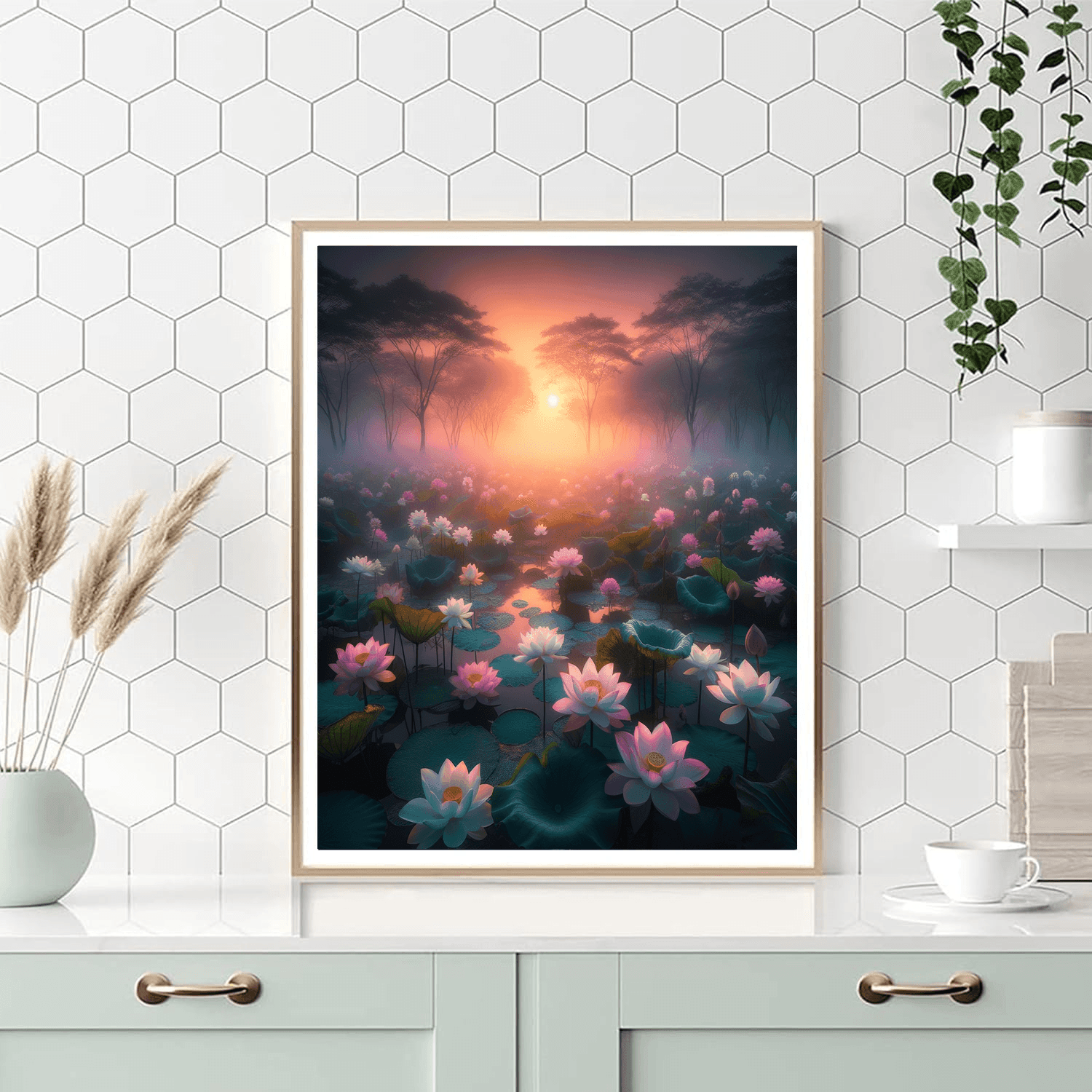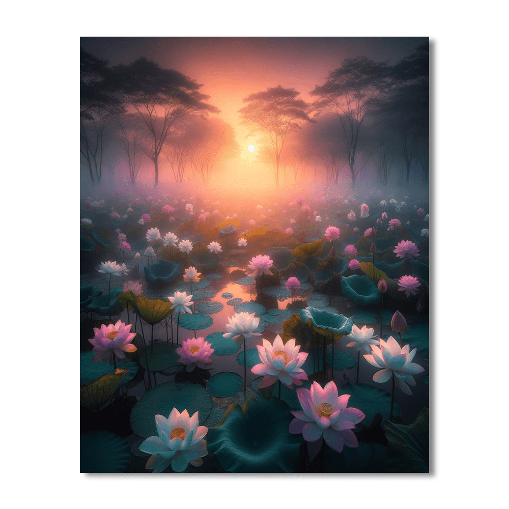 Awaken to the beauty of Serene Lotus Pond at Sunrise. This artwork captures a peaceful pond filled with blooming lotus flowers as the first rays of the sun illuminate the scene. The soft pinks and whites of the lotus flowers contrast beautifully with the dark greens of the lily pads, creating a harmonious and refreshing view. Ideal for spaces that require a calm and rejuvenating atmosphere, such as spas or relaxation rooms.