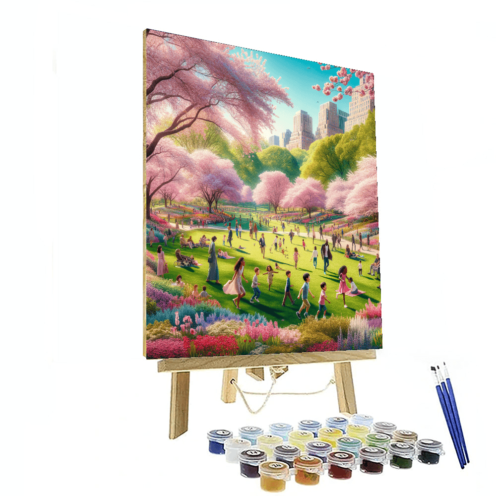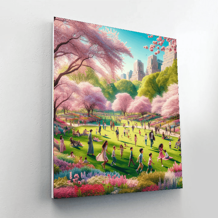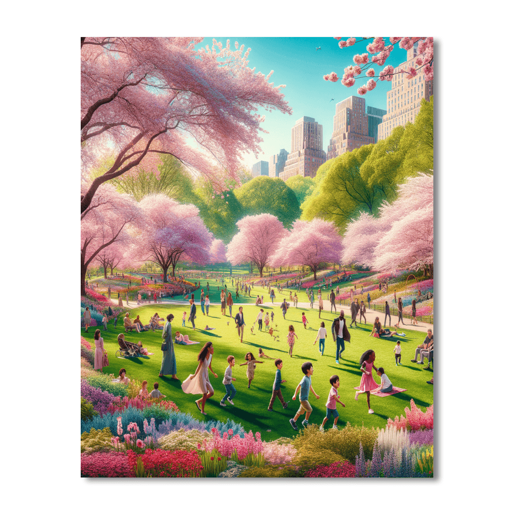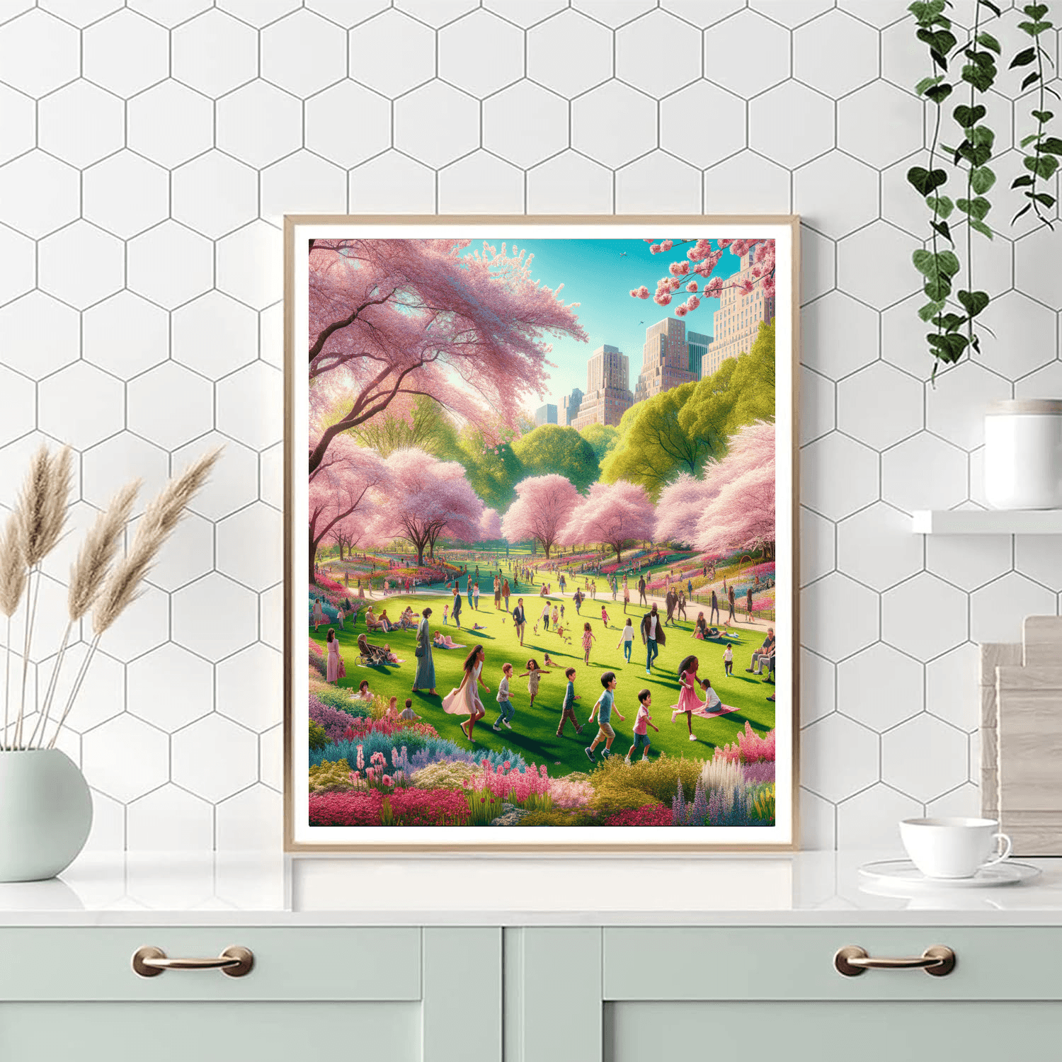 Springtime Symphony is a lively depiction of a park in spring, with children playing and couples strolling among blooming cherry trees. The scene is filled with light and color, capturing the joy and renewal of the season. This artwork is perfect for family rooms or communal spaces, where it can add a sense of life and vibrancy, reminding viewers of the playful and romantic moments that make spring a beloved season.