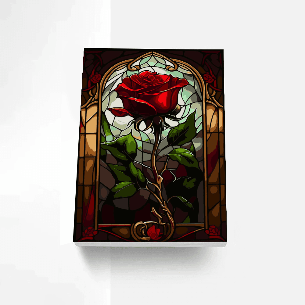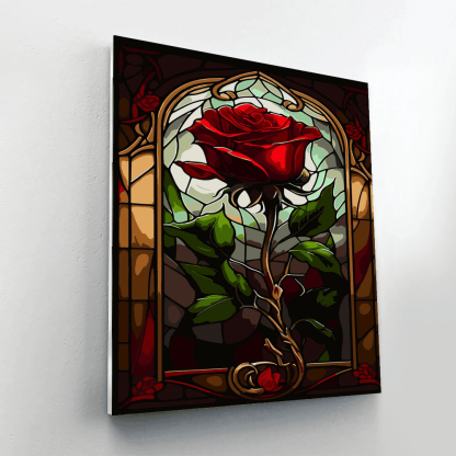 Shape: The rectangular canvas highlights the vertical growth of the rose and the symmetry of the stained glass design.