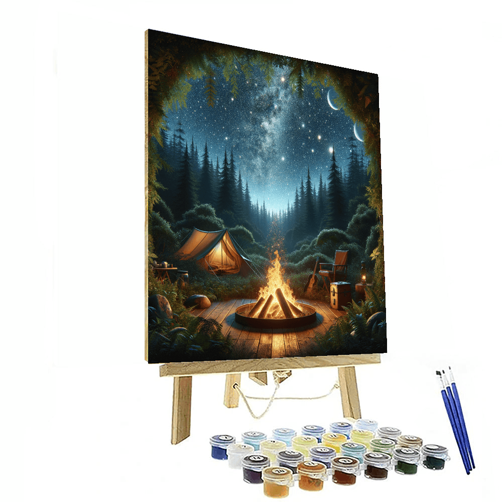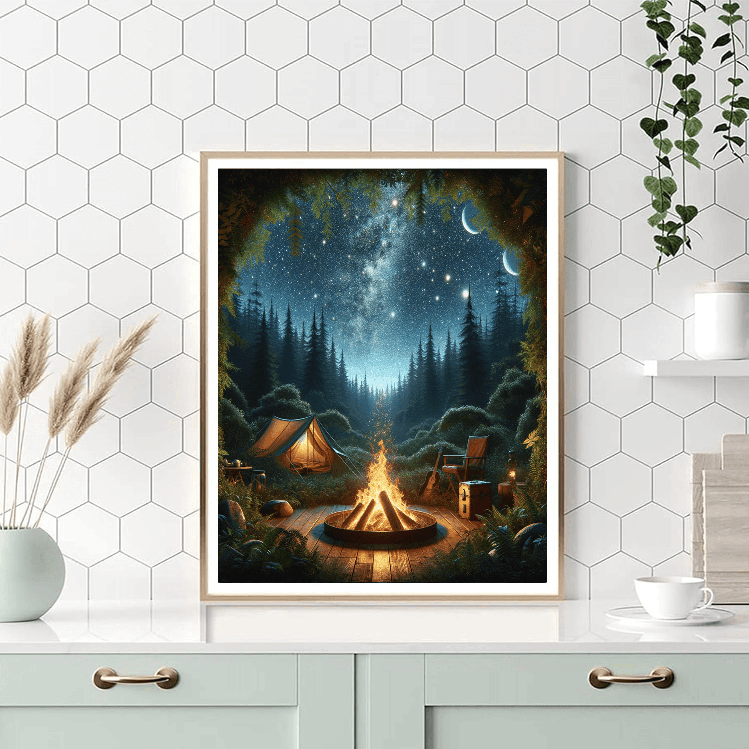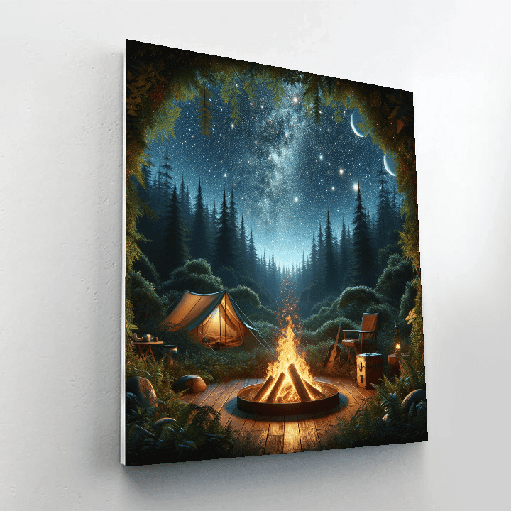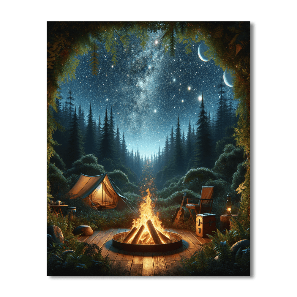 Embark on a starlit camping adventure with this captivating painting of a night under the stars. The glowing campfire, twinkling night sky, and cozy tent create a sense of outdoor wonder. Perfect for nature lovers and camping enthusiasts.