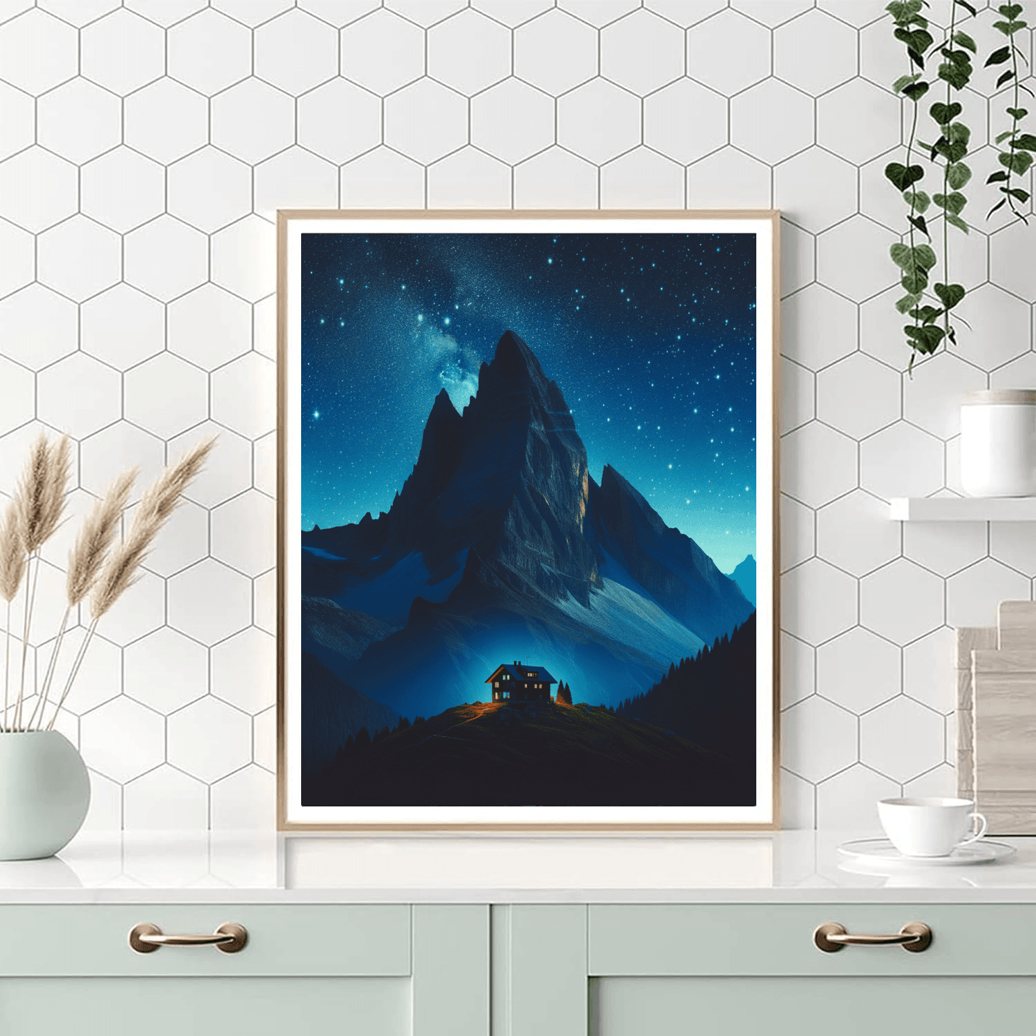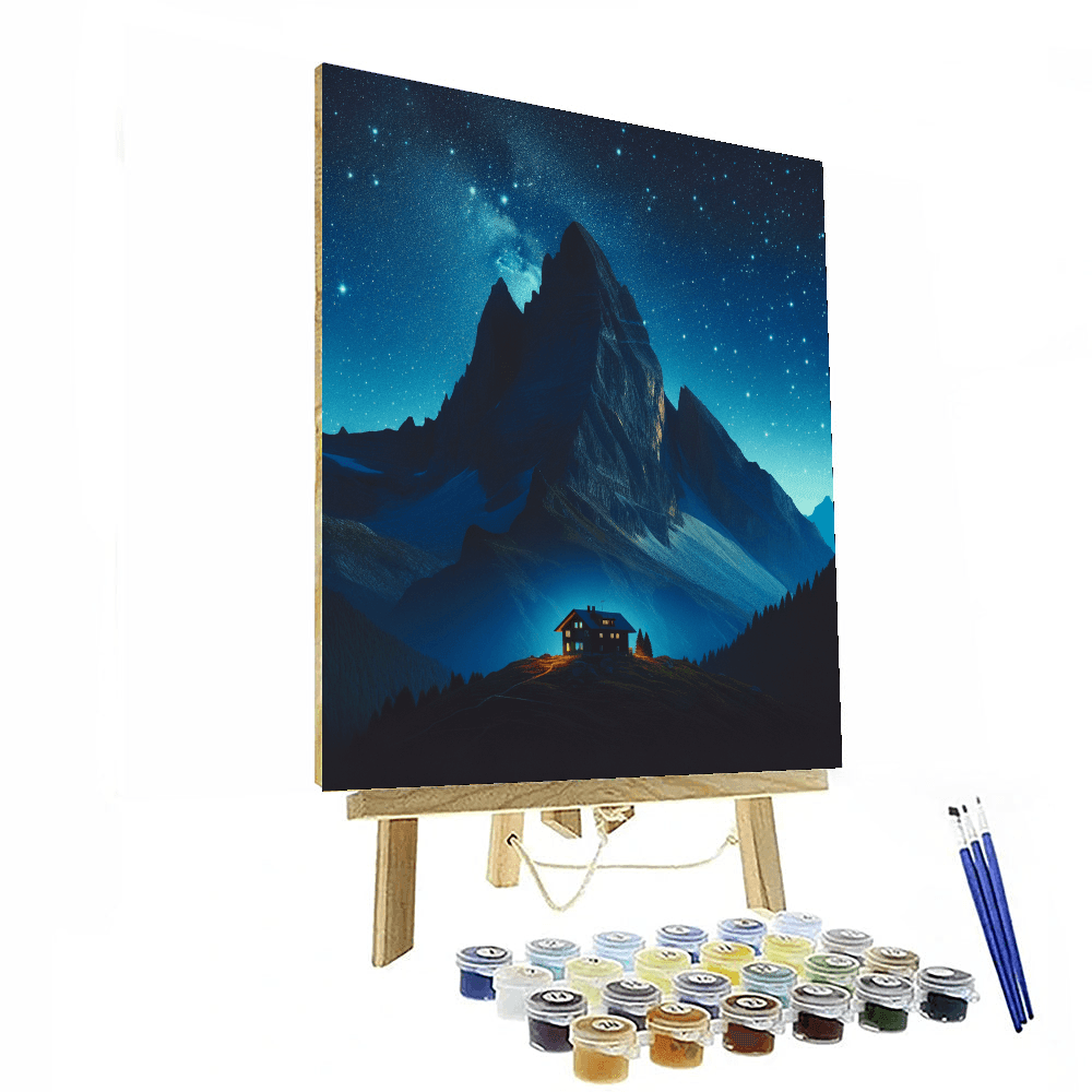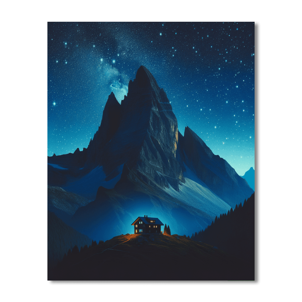 Starry Night Over the Mountain offers a breathtaking nocturnal landscape featuring a rugged mountain under a star-filled sky. The mountains silhouette is stark against the sky, with a small, cozy cabin at its base emitting a warm light. This product is perfect for those who appreciate the beauty of the night sky and the solitude of mountain landscapes, suitable for a bedroom or a quiet study, providing a peaceful and inspiring backdrop.