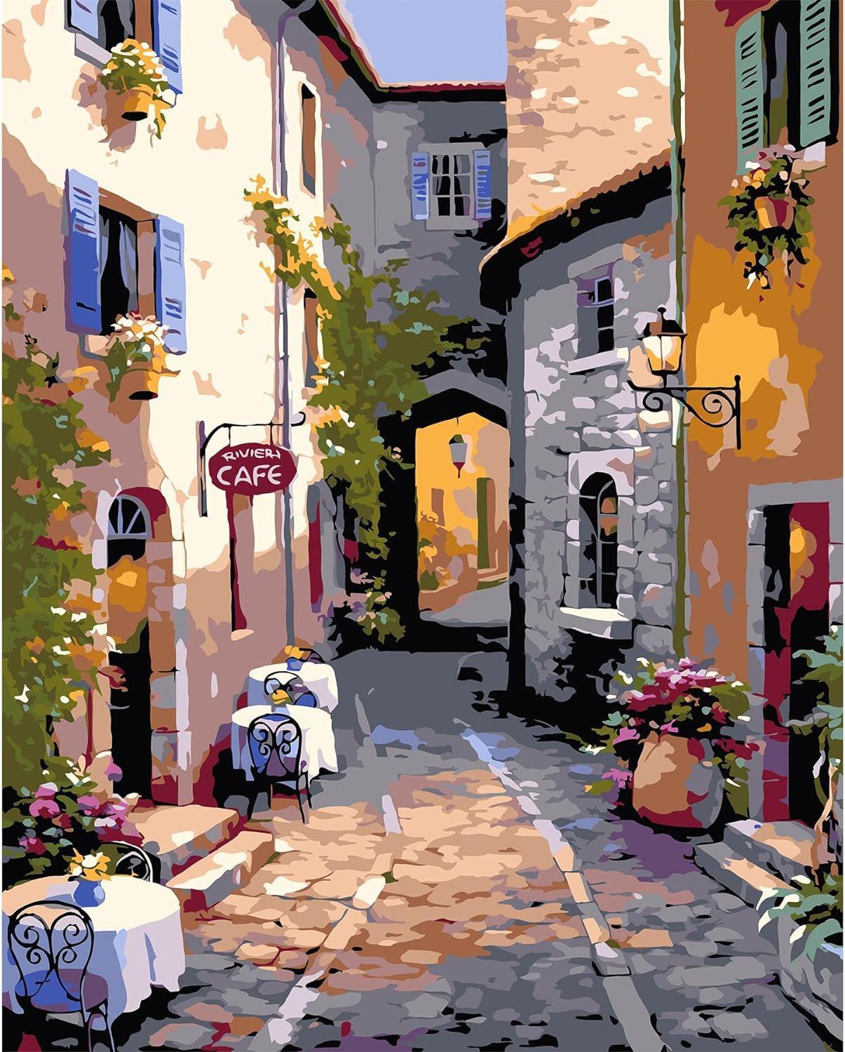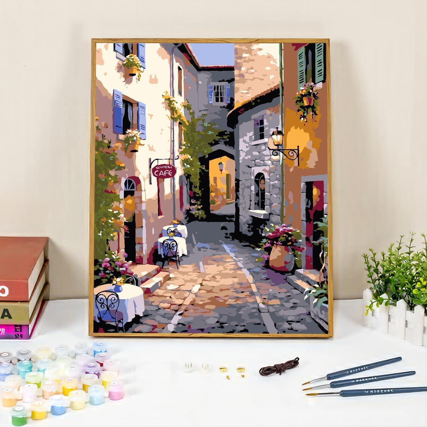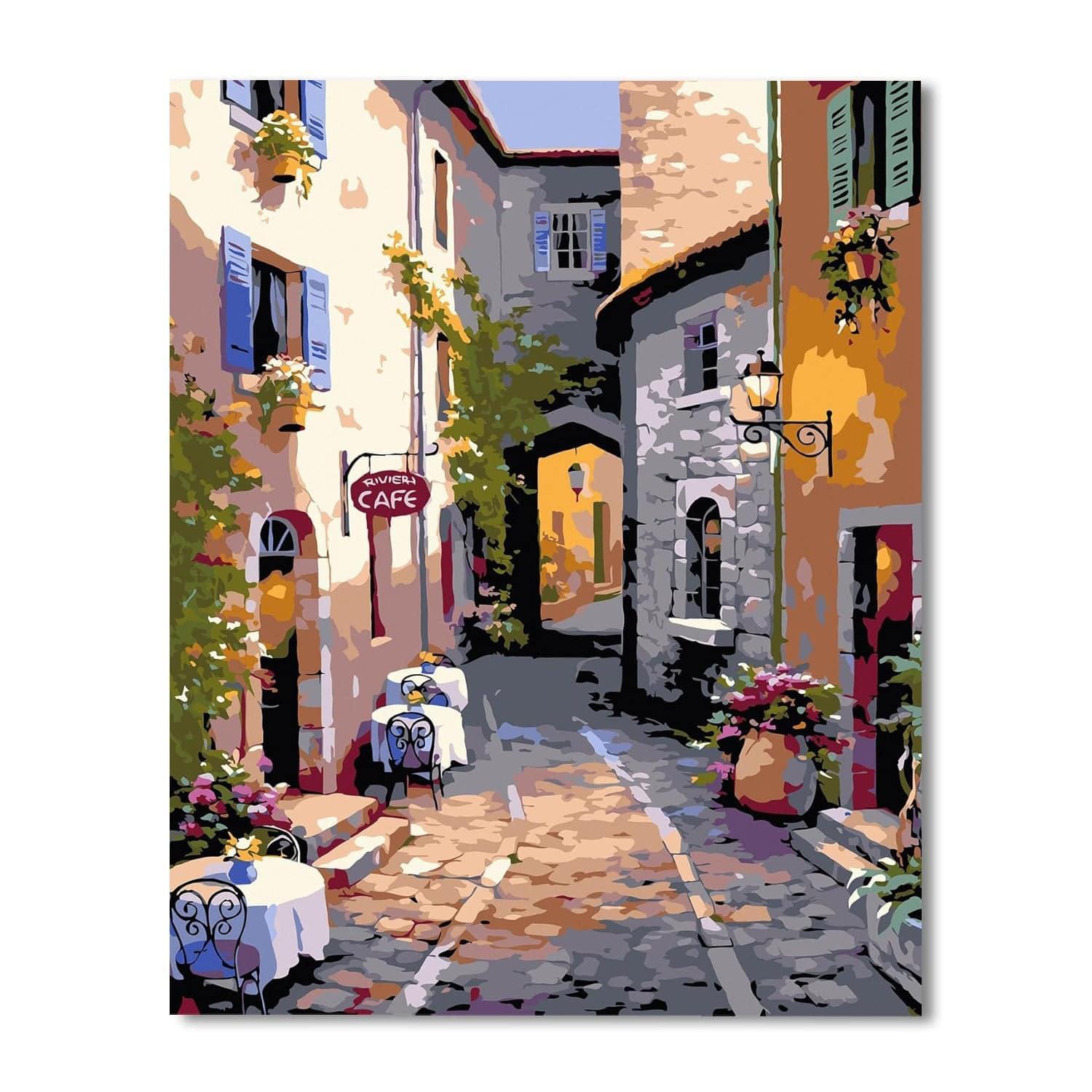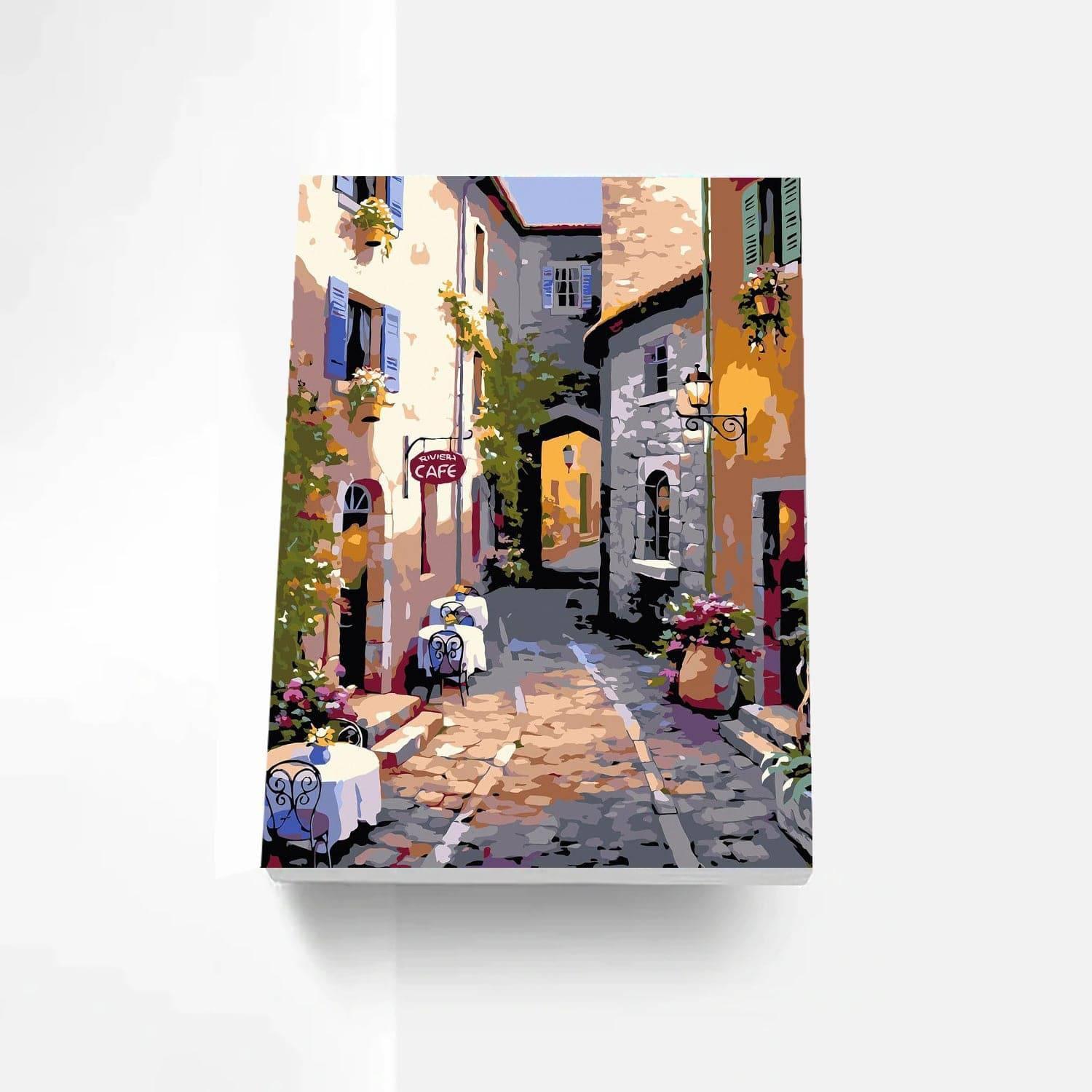 This Street Scenery Print Paint By Number Kit invites you to meander through the sunny, flower-lined pathways of a quaint European town. The image captures a serene alley basked in the warmth of the sun, flanked by colorful buildings, and leading to a cozy cafe, inviting you to pause and enjoy the picturesque beauty of this idyllic setting.