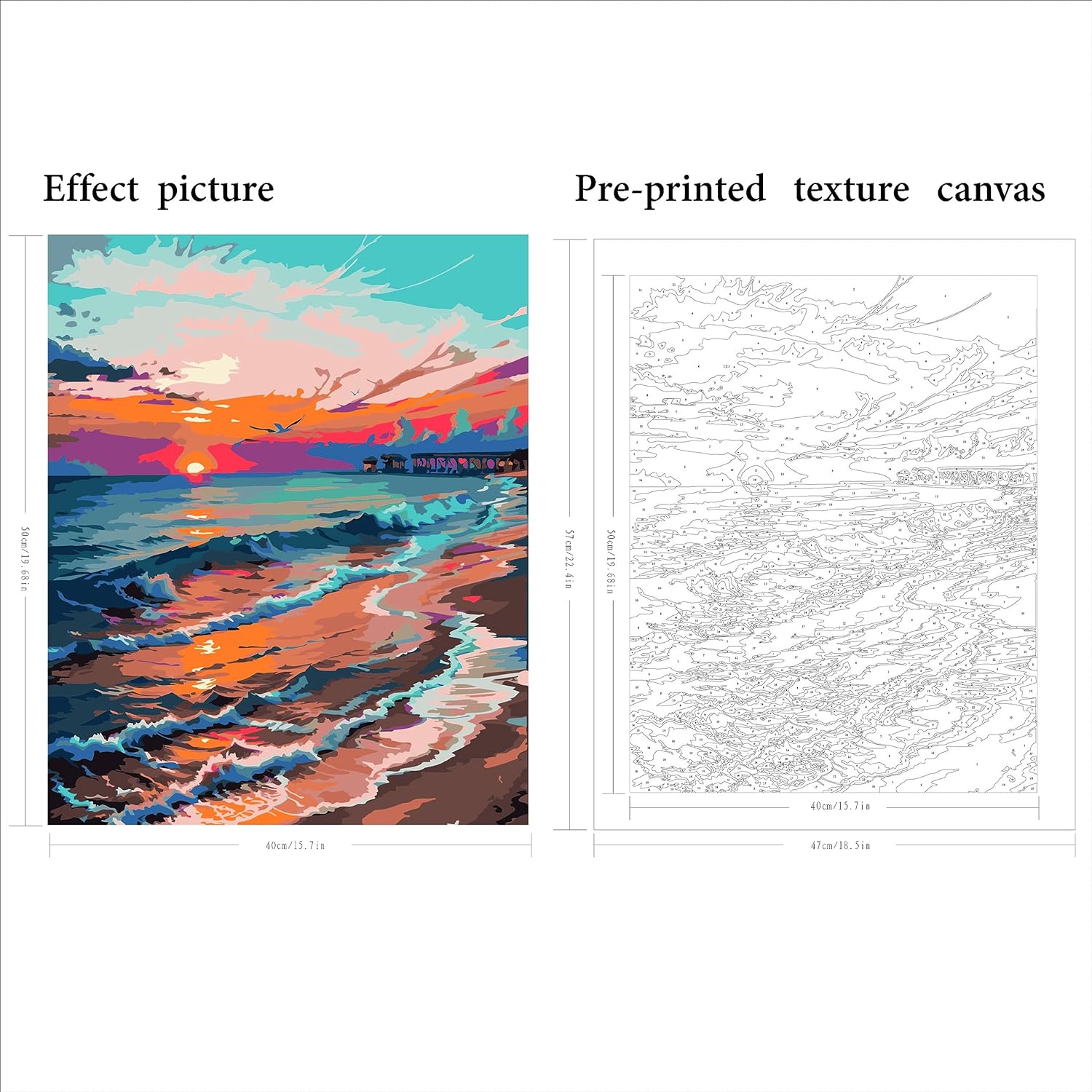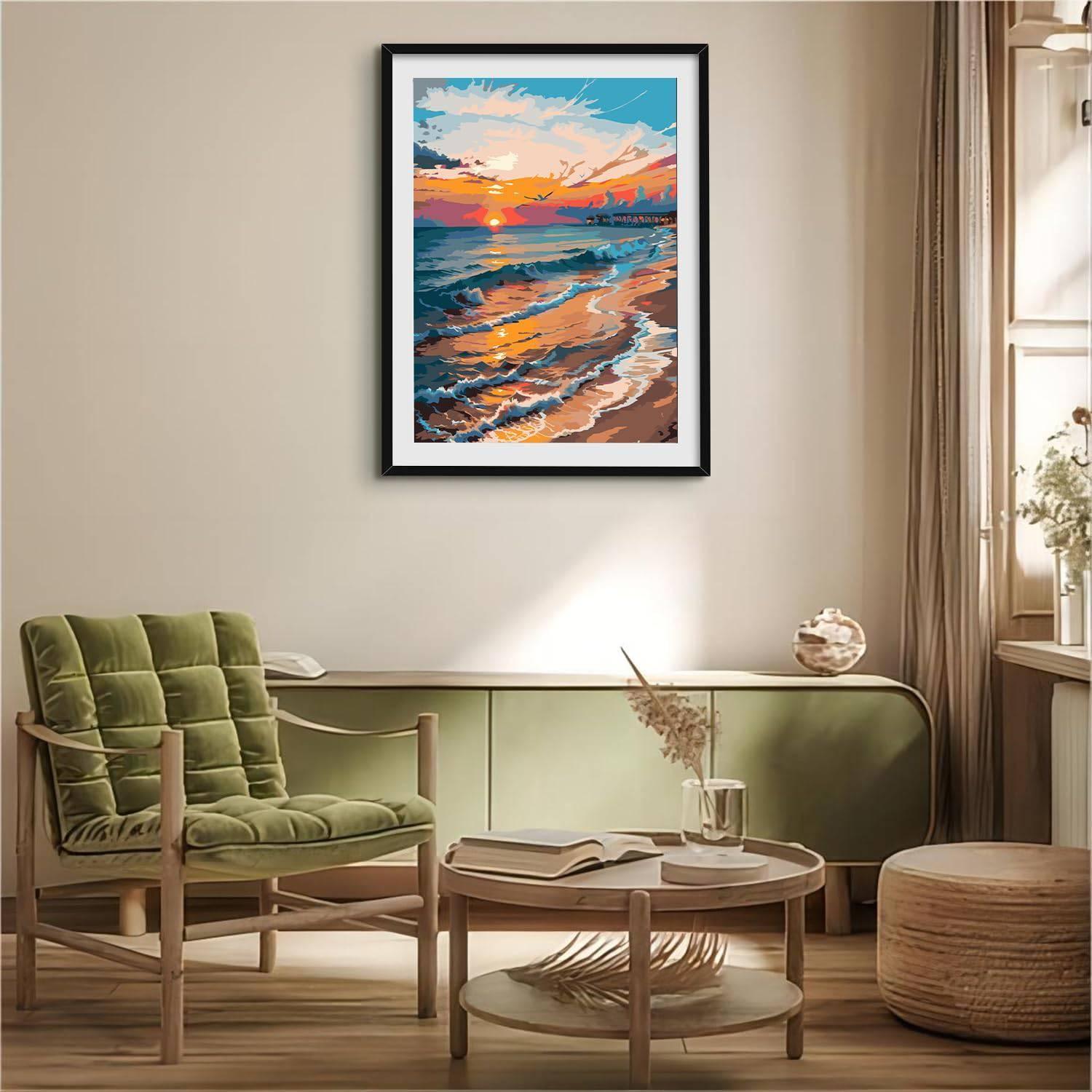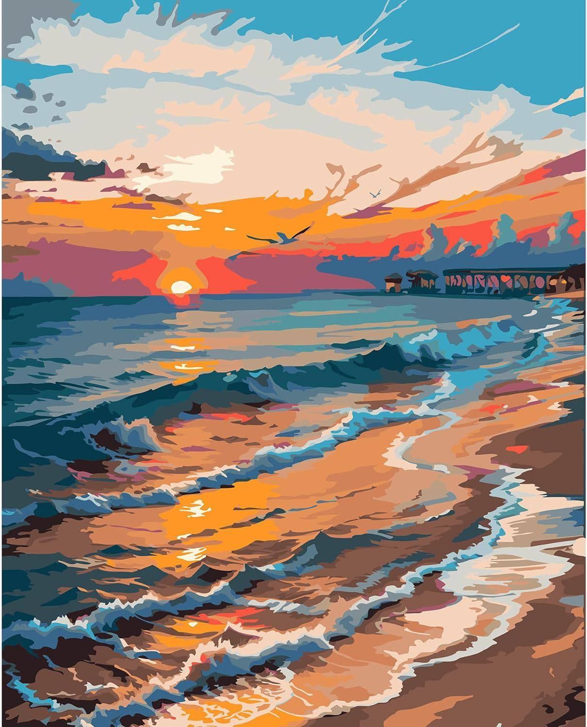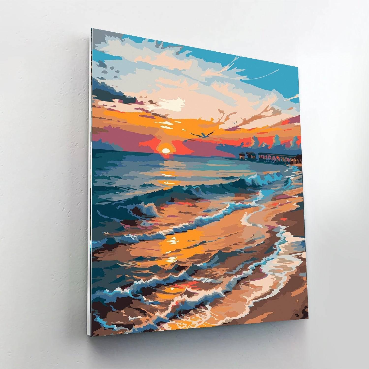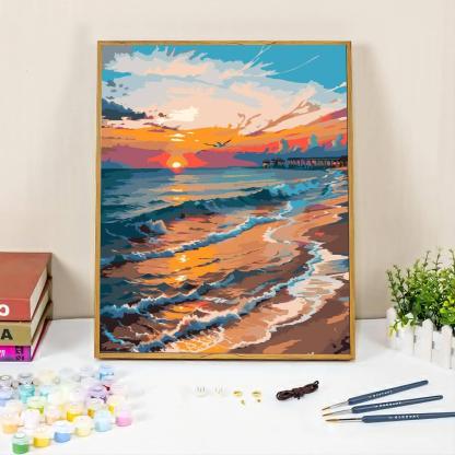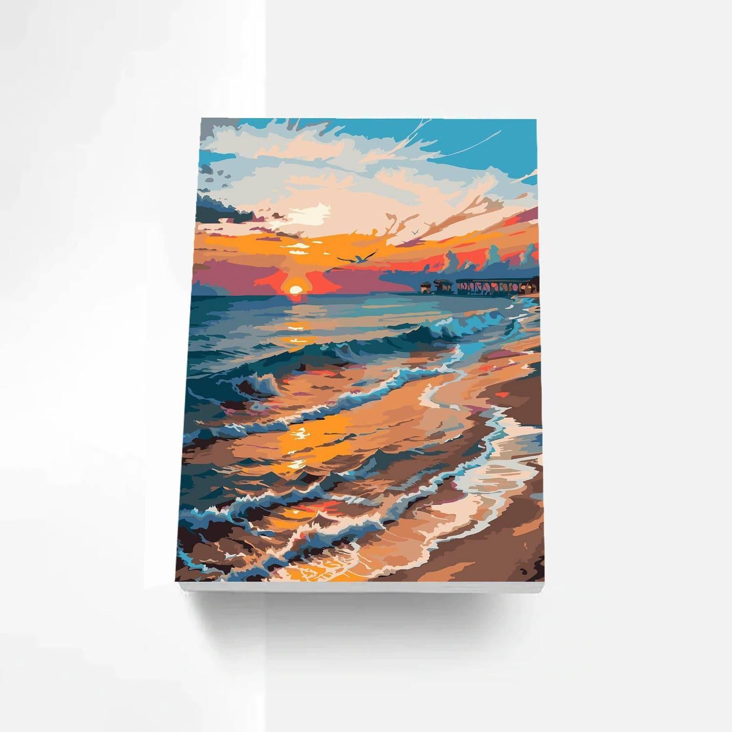 This Sunset Seascape Paint By Number Kit captures the dynamic and reflective essence of the ocean at sunset. With a pier extending into the glowing horizon, the sky ablaze with shades of orange and purple, and waves gently lapping the shore, it's a window to a moment of natural splendor that calms and captivates.