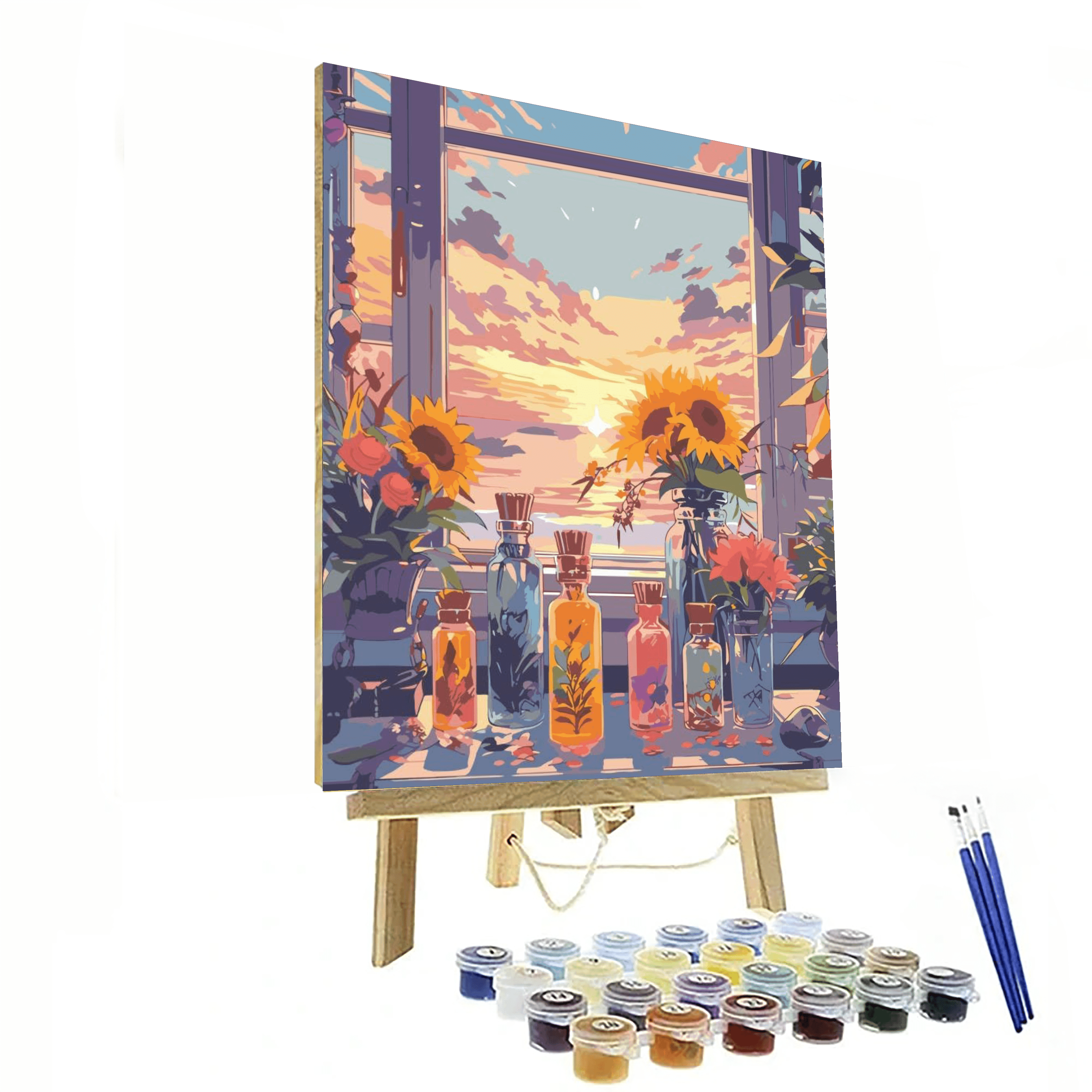 Delve into a serene art session with our Sunset Serenity Sunflower Paint by Numbers Kit. This artistic endeavor features a tranquil window view that opens to a sunset sky, with radiant sunflowers and delicate floral arrangements set in glass vases, combining the gentle end of day light with the quietude of indoor charm.
