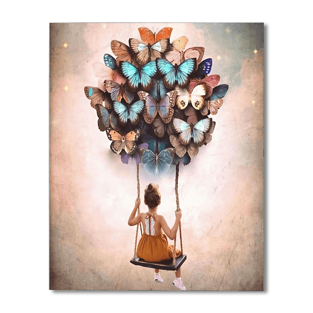 Unleash your creative spirit with the Swing and Butterfly Paint By Numbers Kit. This artistic endeavor captures a whimsical moment of a young dreamer on a swing, surrounded by a kaleidoscope of butterflies. It's an engaging project that allows for personal expression through painting, ideal for decorators and aspiring artists alike.