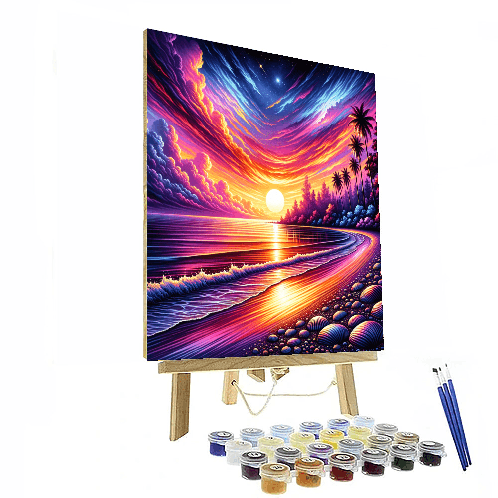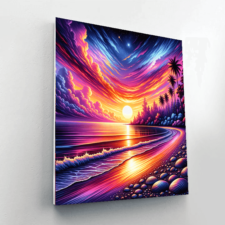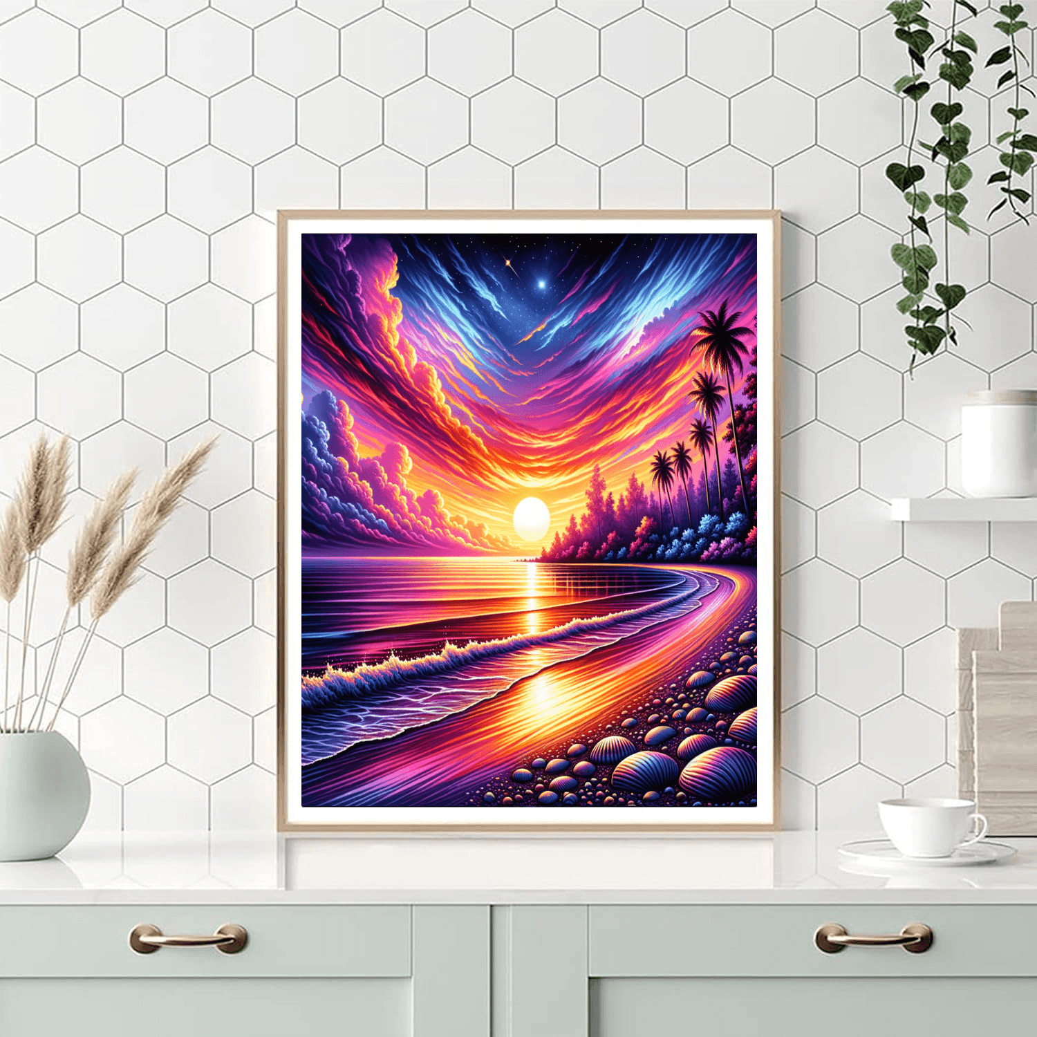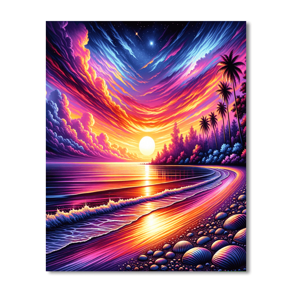 Experience the warmth of a tropical sunset with this vibrant depiction of a sunset over a beach. This product is perfect for those who love the beach and want to bring a piece of paradise into their home. Ideal for living rooms, bedrooms, or vacation homes, it creates a relaxing and inviting atmosphere.