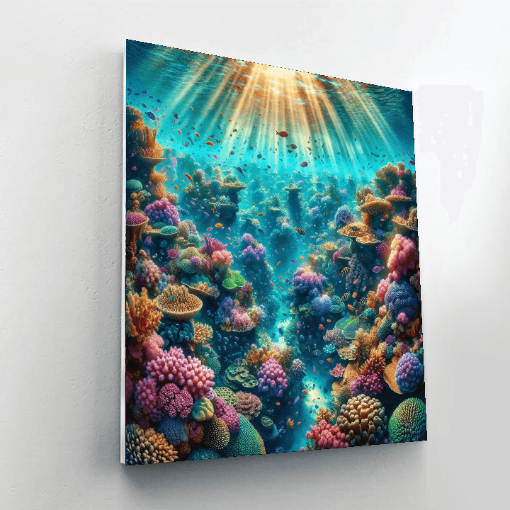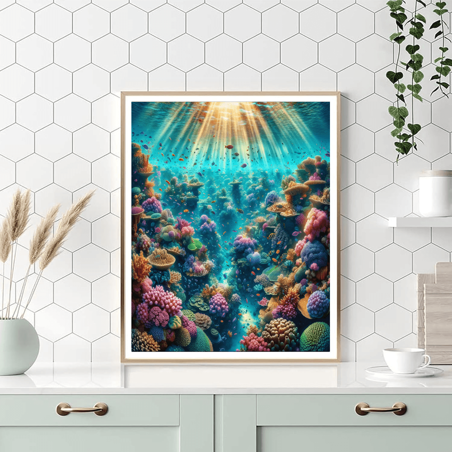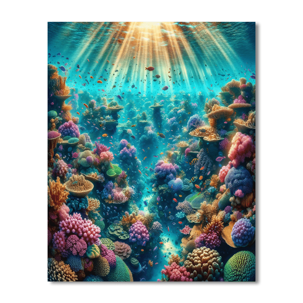 Explore the vibrant and colorful world beneath the sea with this depiction of a coral kingdom. Brightly colored corals, bustling with marine life, offer a glimpse into the biodiversity of ocean ecosystems. This product is perfect for enthusiasts of marine biology or anyone who appreciates the beauty of the underwater world. It would be a striking feature in a bathroom, spa area, or any space where a calming, aquatic theme is desired.