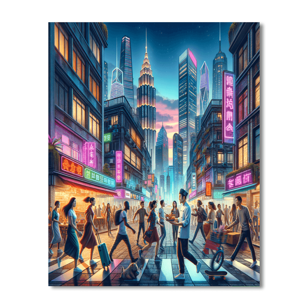 Feel the dynamic energy of the city with Urban Pulse, where the bustling streets and towering skyscrapers capture the essence of urban life. This piece features vibrant scenes of city dwellers and neon lights, reflecting the constant motion and vibrancy of metropolitan areas. Perfect for those who thrive on city vibes, its ideal for modern living spaces or offices, adding a contemporary and energetic touch.