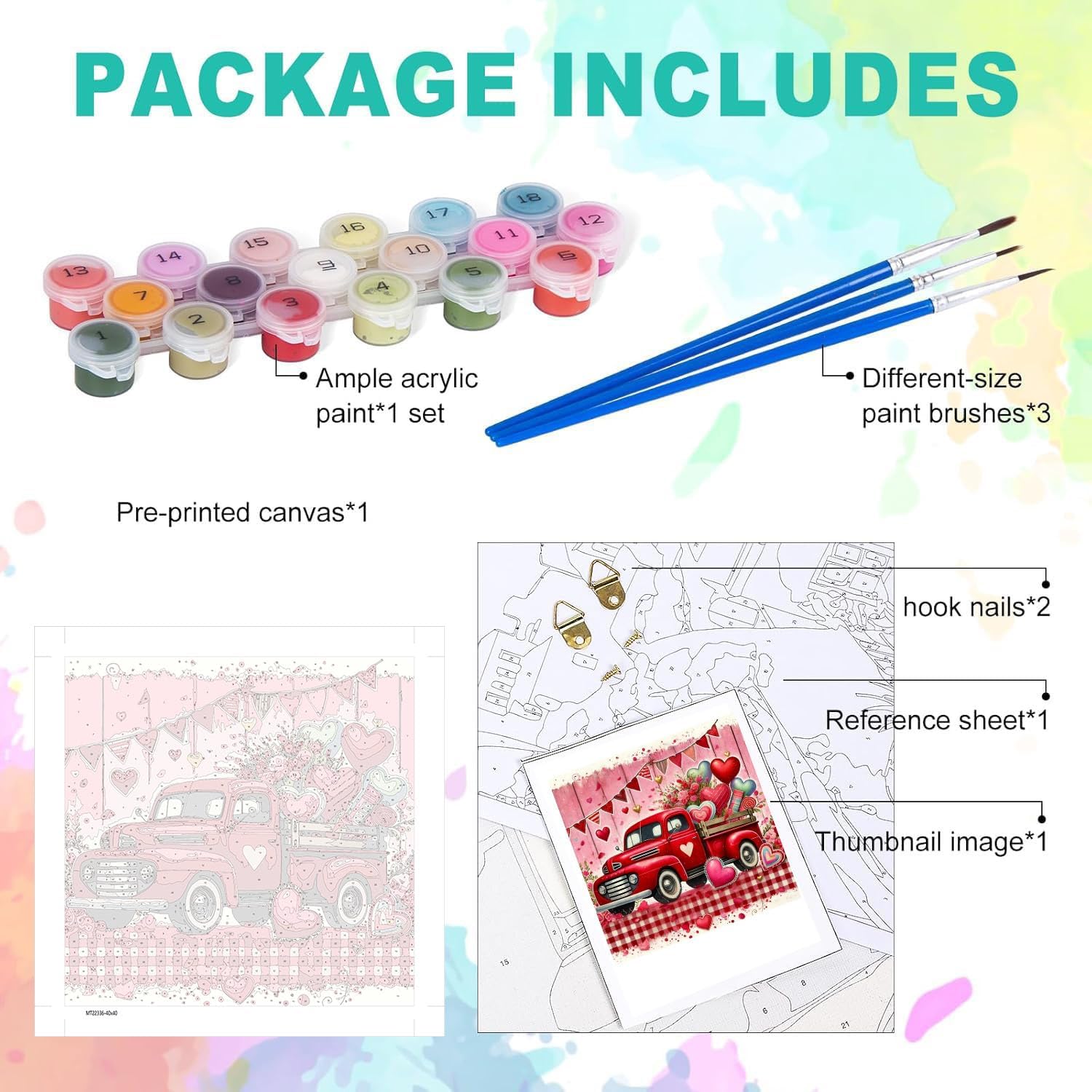 Create seasonal wall decor with this Valentine's Day Truck Paint By Numbers Kit For Adults On Canvas With Paint Set. It includes a 16x16 pre-printed canvas, acrylic paint set, and three brushes. The kit also includes a postcard guide, reference paper, and metal hooks for hanging. Use it for DIY decor, craft sessions, or gifting. The finished truck-themed artwork adds a festive Valentine's touch to your home.