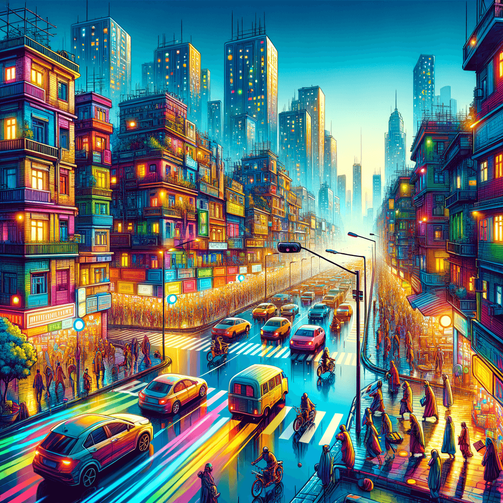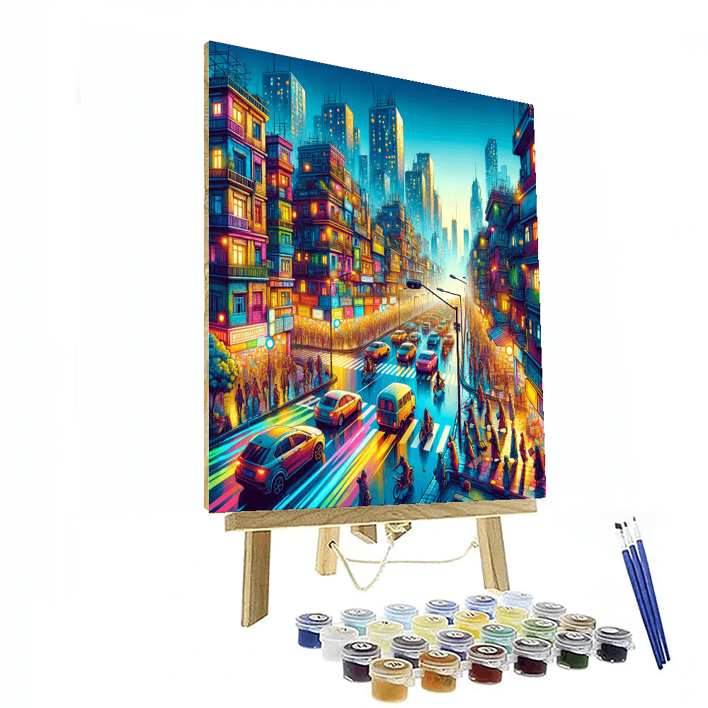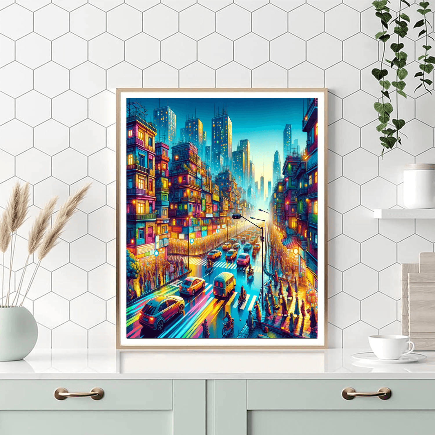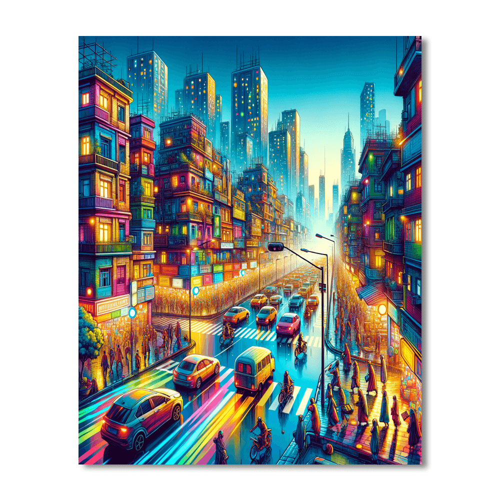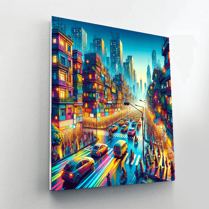 Capture the energy of urban living with this vibrant cityscape. The bustling streets are filled with colorful buildings, lively pedestrians, and bright lights. Perfect for modern living spaces or offices, this artwork adds a dynamic touch to any environment. Ideal for city lovers and those who thrive in the hustle and bustle, it serves as a reminder of the excitement and diversity found in urban life.