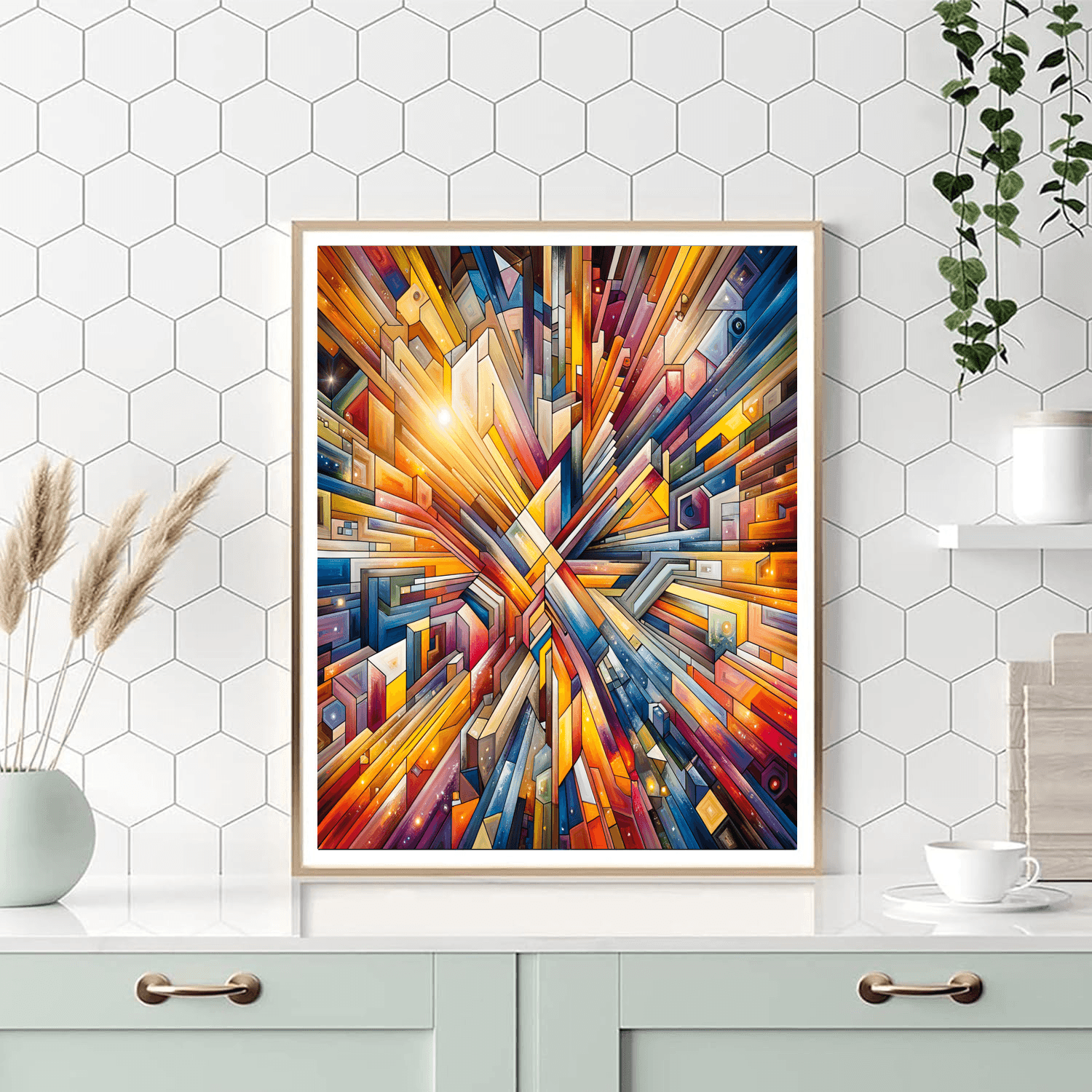Experience a fusion of vibrant geometric shapes and colors in this dynamic painting. Bold lines and patterns intertwine to create a visually striking composition that energizes the space. Perfect for those who appreciate modern art with a pop of color.