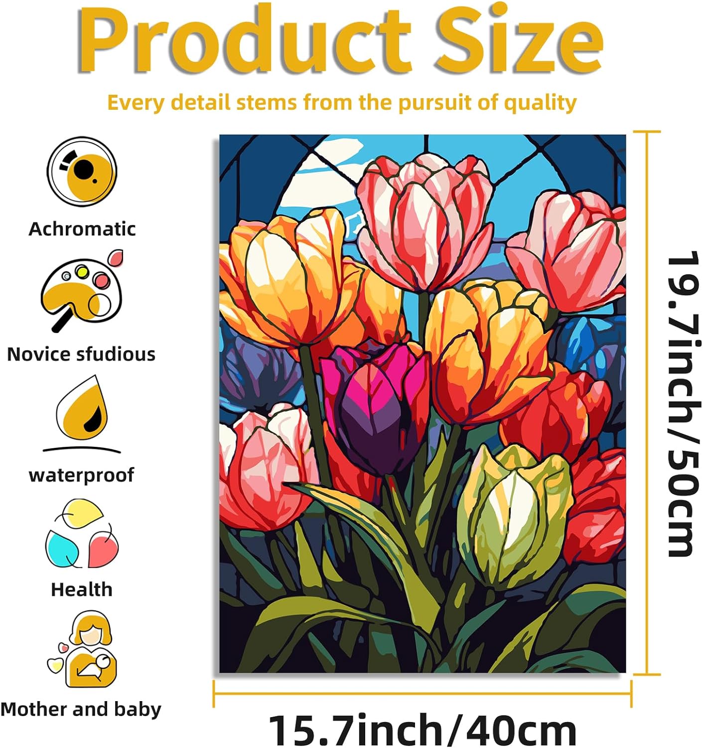 Immerse yourself in a world of color with the "Vibrant Tulips Mosaic" Paint by Number Kit. Designed for both the novice and seasoned painter, this set allows you to create an enchanting array of tulips that mimic the look of stained glass, bringing a burst of color to any space.
