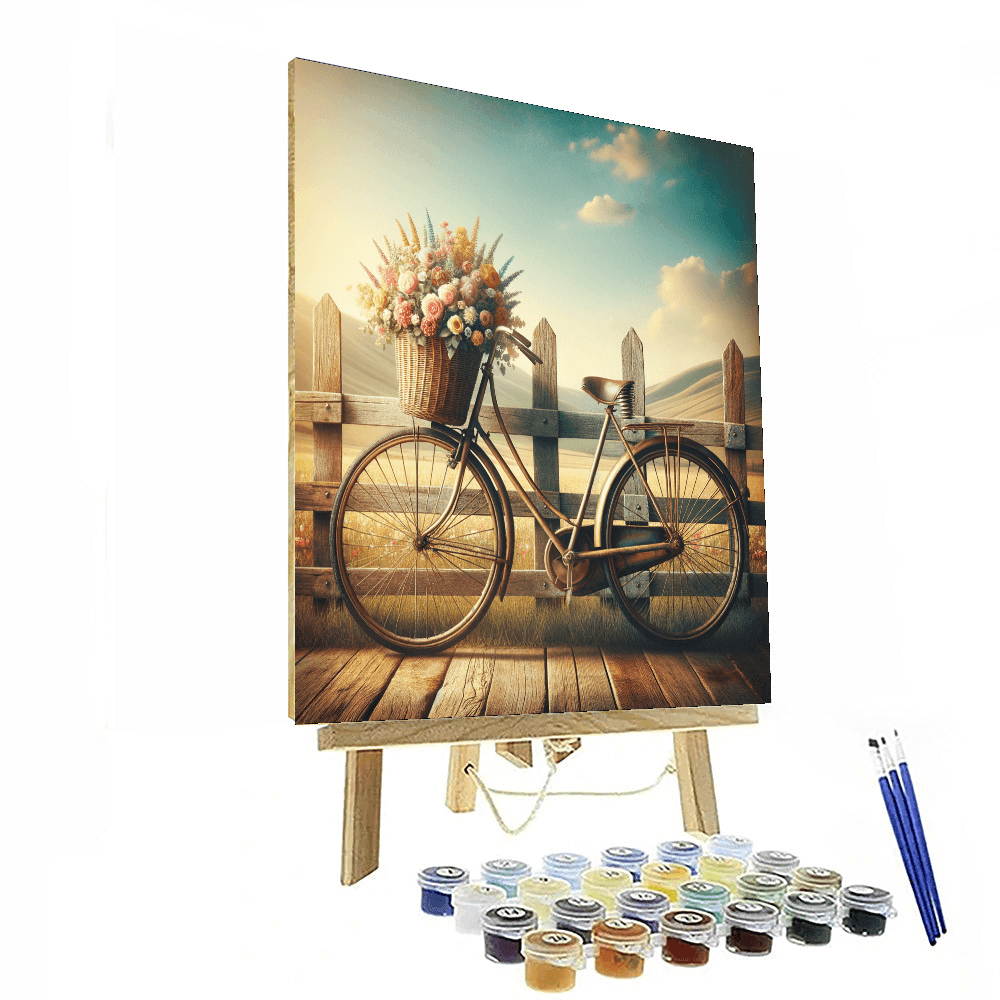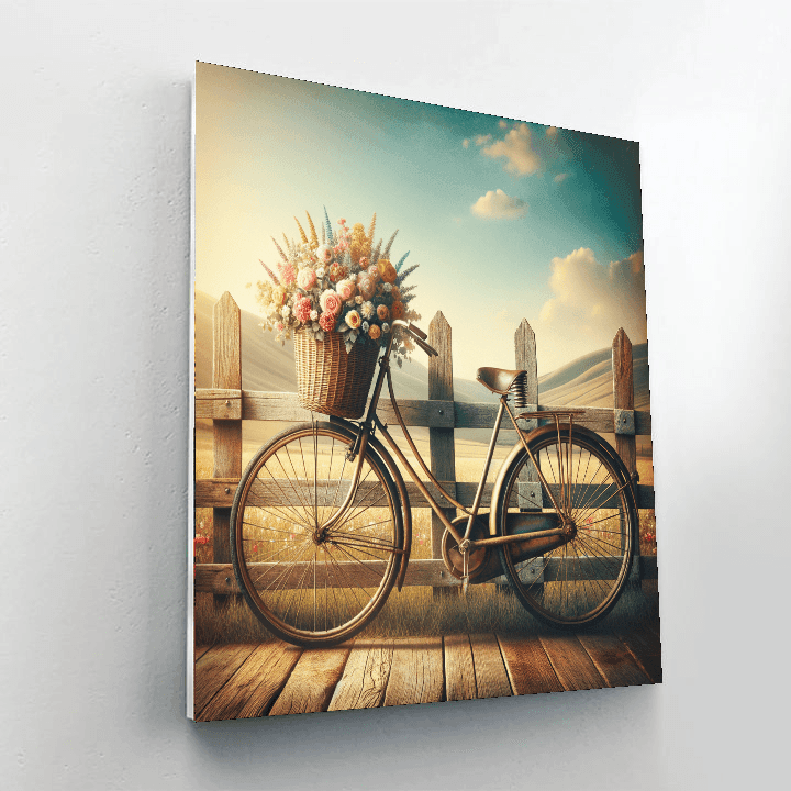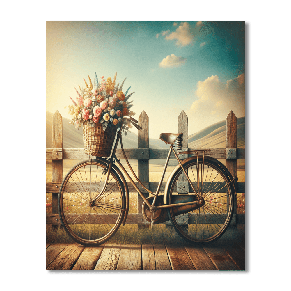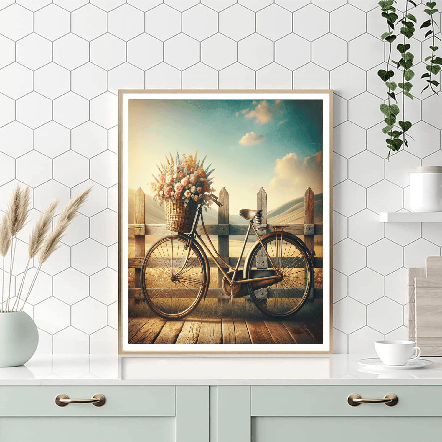 Add a touch of nostalgia and charm to your space with the Vintage Bicycle Bloom. This artwork features an old-fashioned bicycle adorned with a basket overflowing with fresh flowers. The scene evokes a sense of leisurely strolls through quaint countryside lanes. Ideal for a kitchen, hallway, or garden room, this piece brings a warm, inviting feel to any space. The soft pastel colors and delicate details make it a delightful addition that can brighten up your home and evoke memories of simpler times.