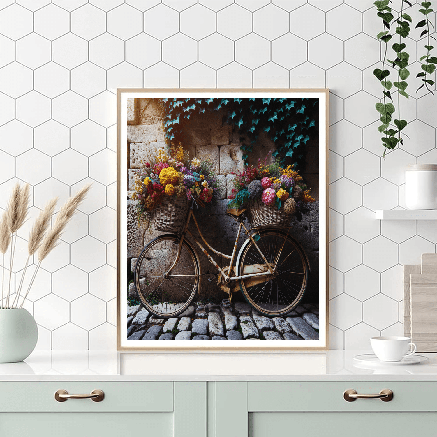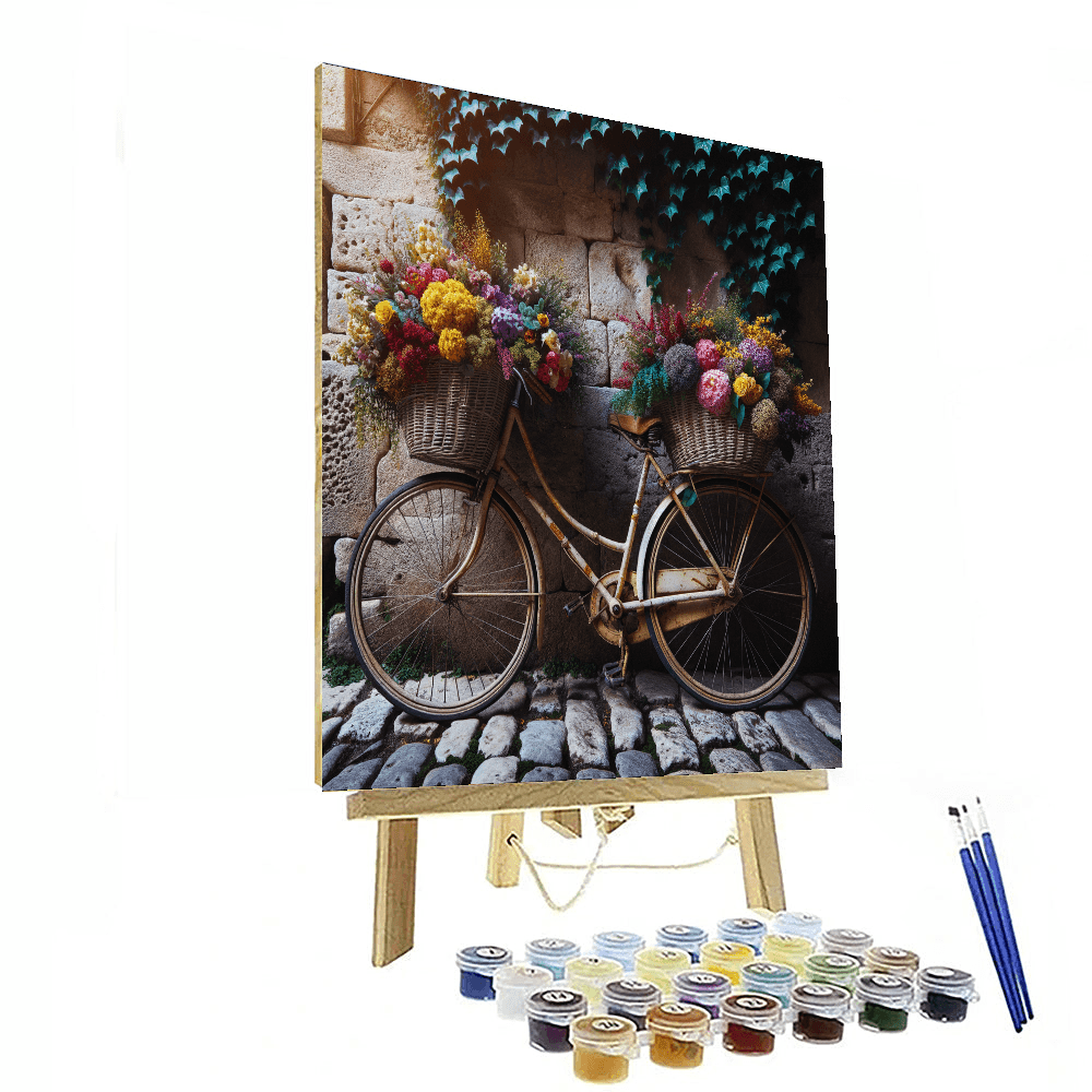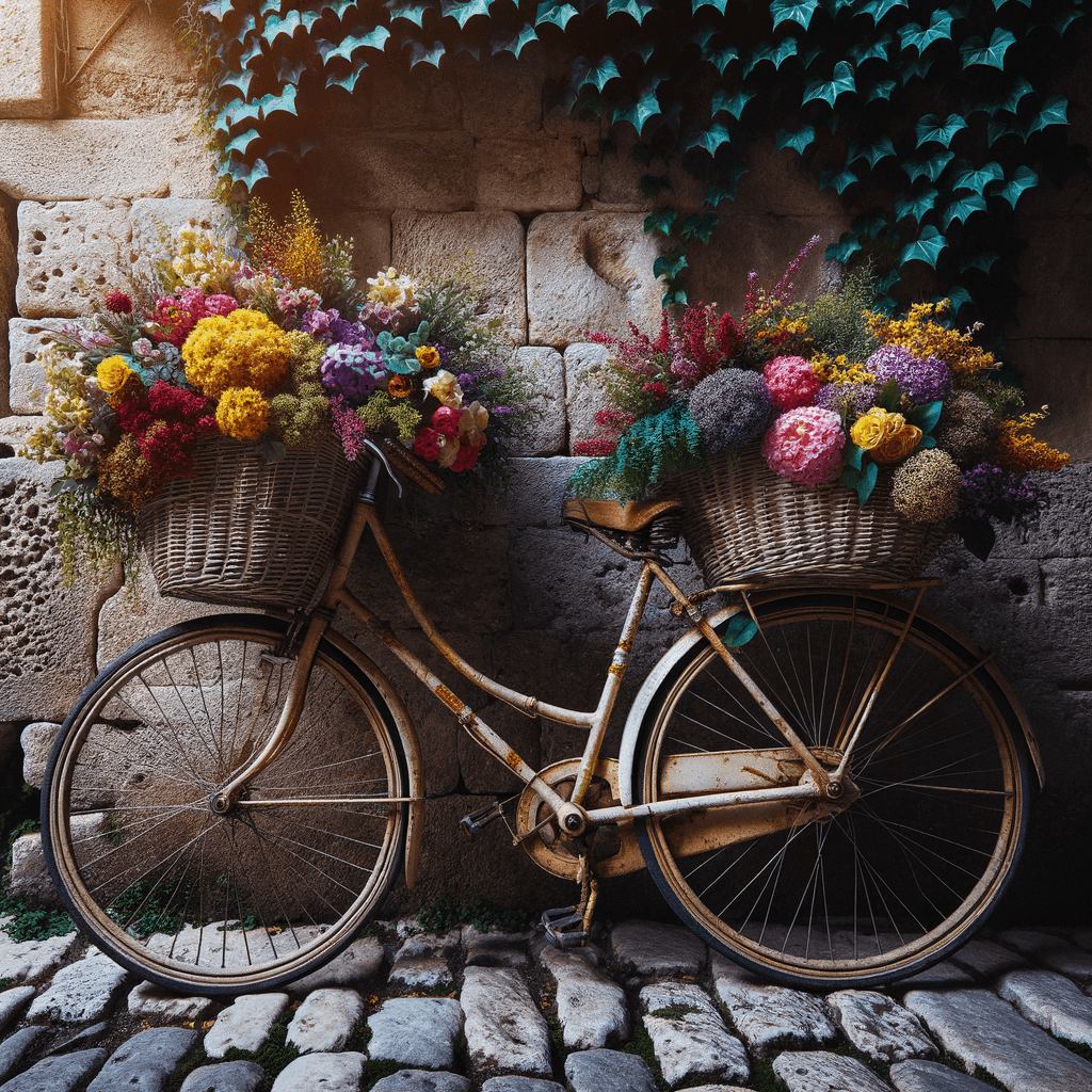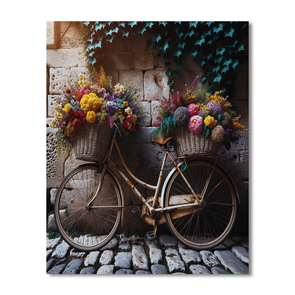 A charming depiction of a vintage bicycle adorned with a basket overflowing with fresh, vibrant flowers. Ideal for adding a nostalgic touch to a living room or hallway.