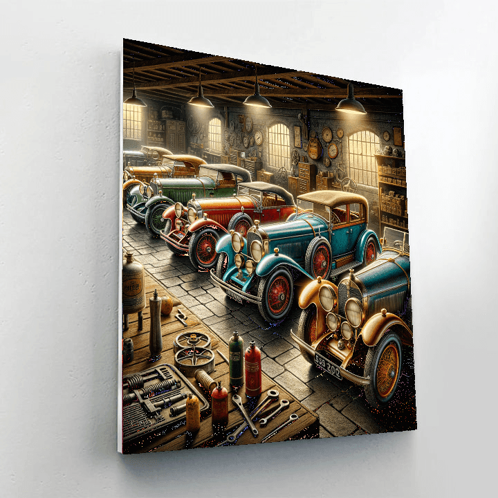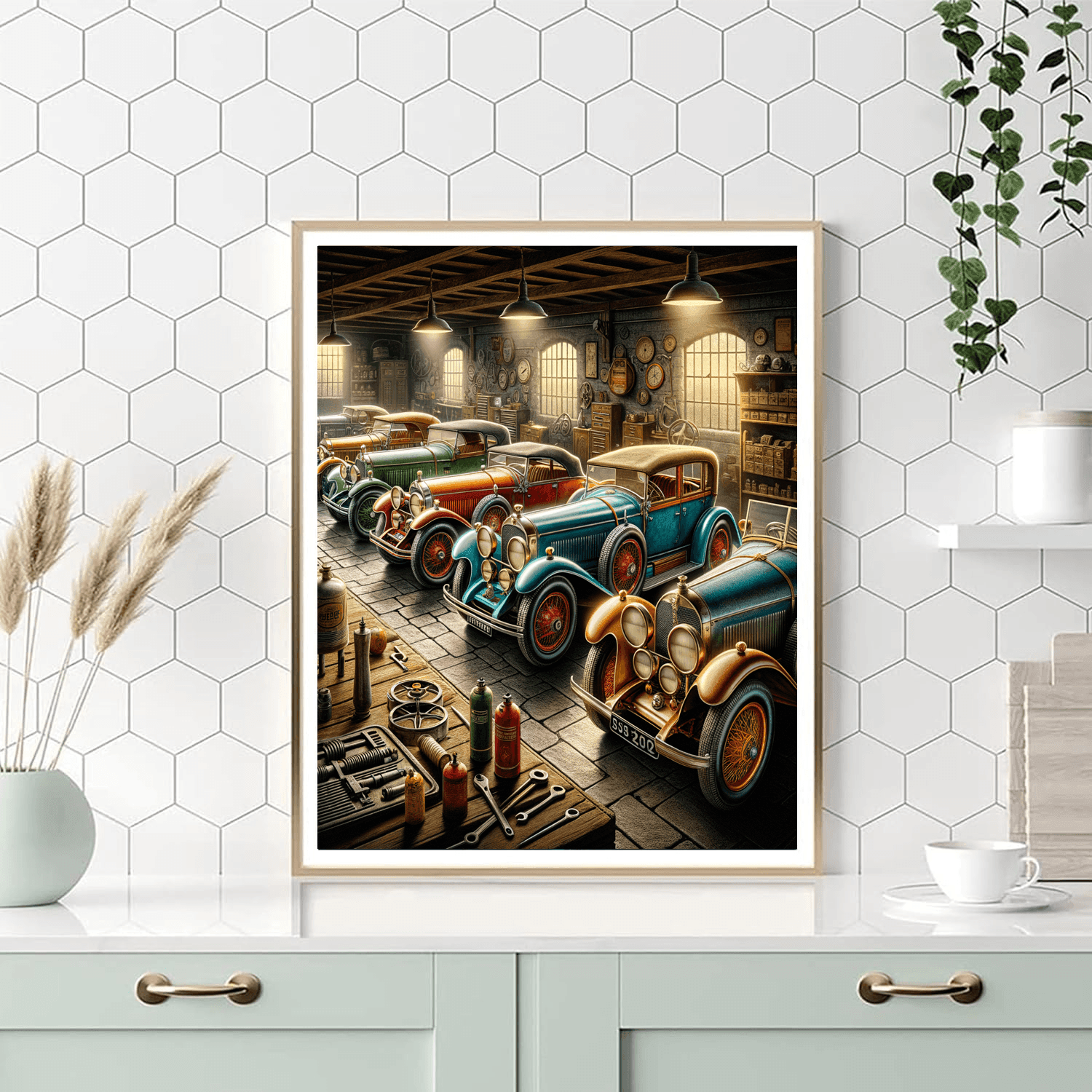 Rev up your decor with Vintage Car Collection. This piece features a lineup of classic vintage cars in an array of vibrant colors, each car boasting unique and intricate details. Its a must-have for car enthusiasts or anyone who appreciates the artistry of vintage automobiles. Ideal for a garage, man cave, or living room, it adds a touch of nostalgia and class.
