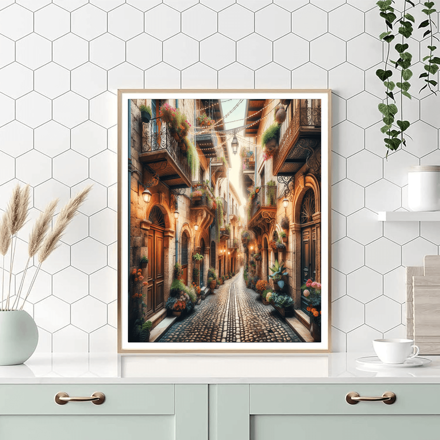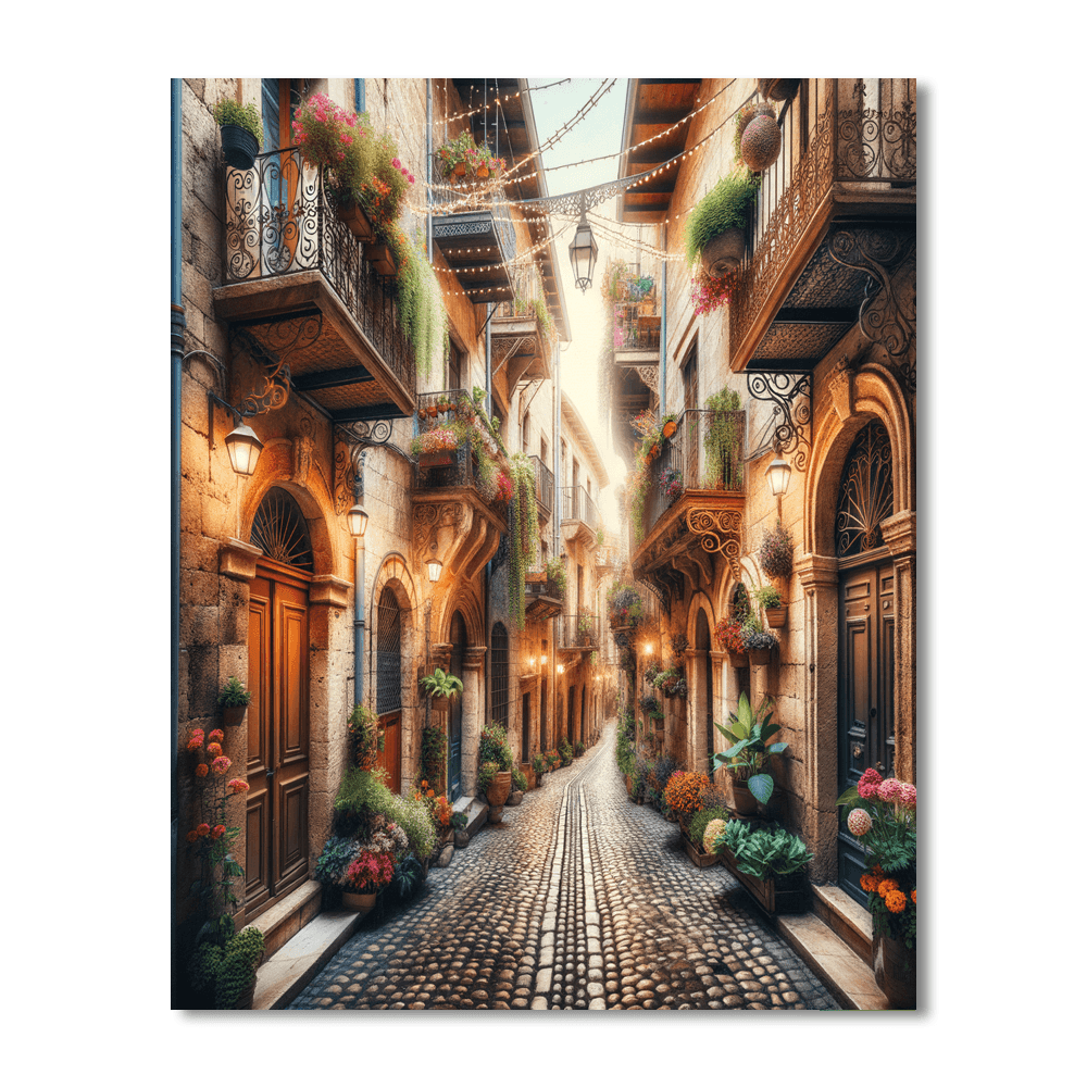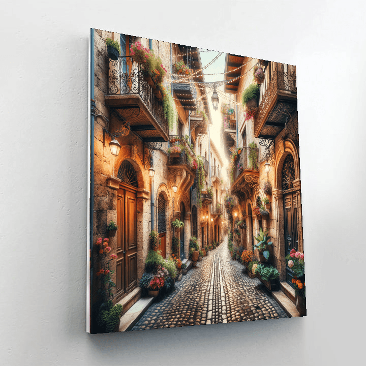 Step back in time with the Vintage European Alley, which captures the essence of a quaint alley in an old European town. Cobblestone paths, vibrant flower baskets hanging from rustic balconies, and warm, inviting café lights create a charming scene. This nostalgic piece is perfect for adding a touch of old-world charm to your dining area, hallway, or any space that could use a storybook-like enhancement.