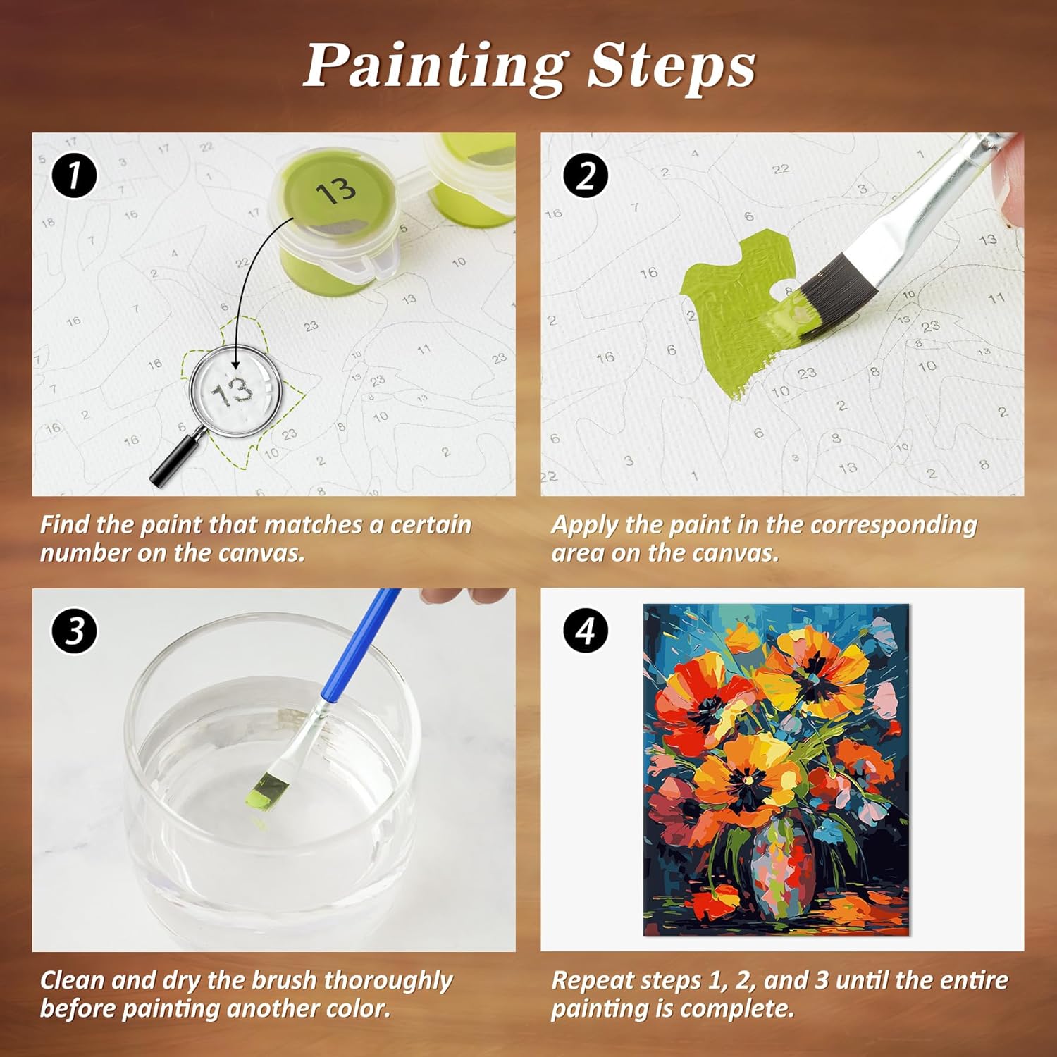 Special Features: This Paint By Number Kit comes with a vibrant array of colors that bring the floral scene to life.