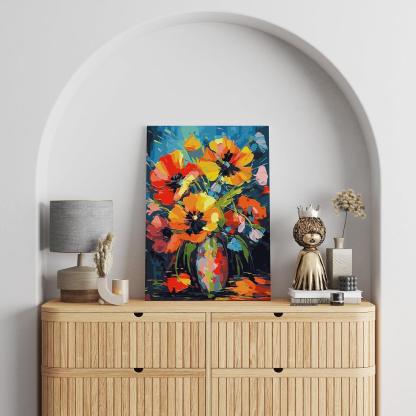 Design: The artwork captures a striking still life of flowers in a vase, using a bold and dynamic color palette.