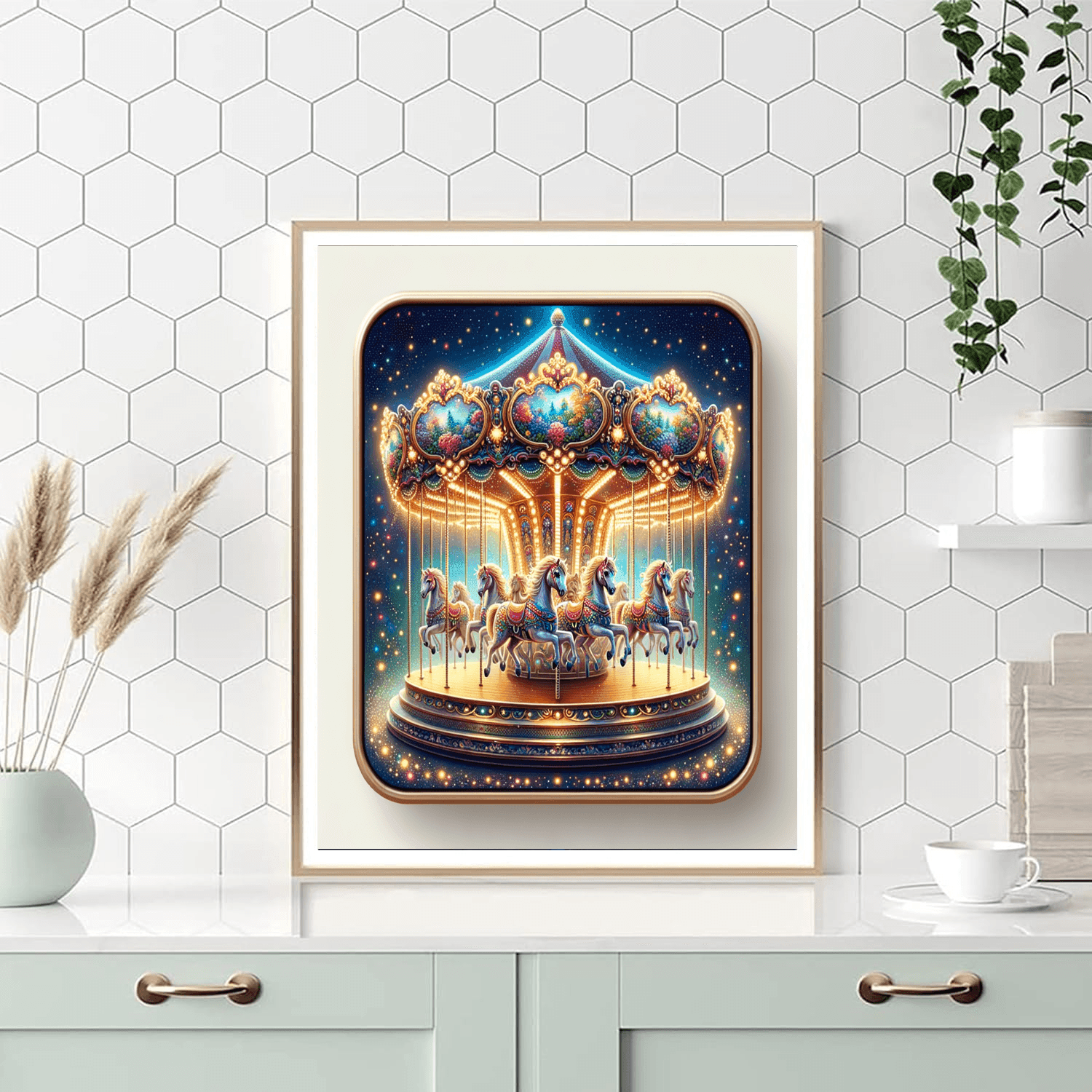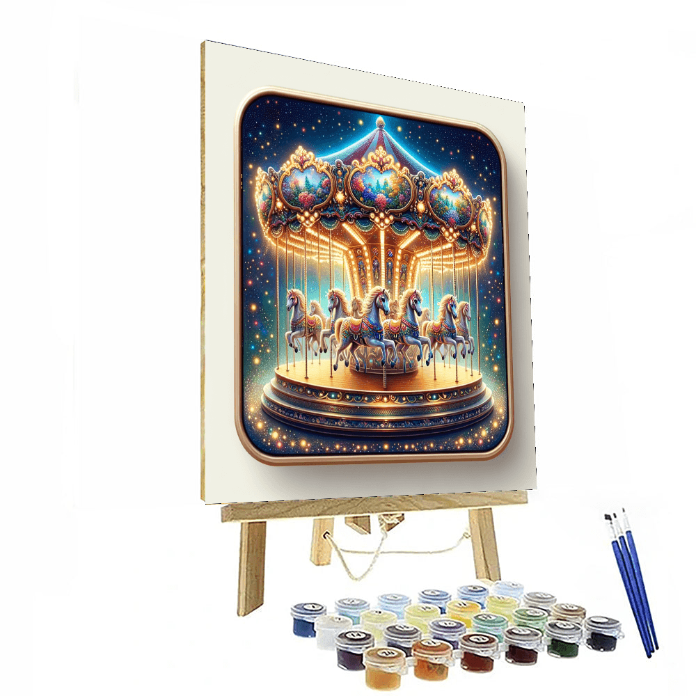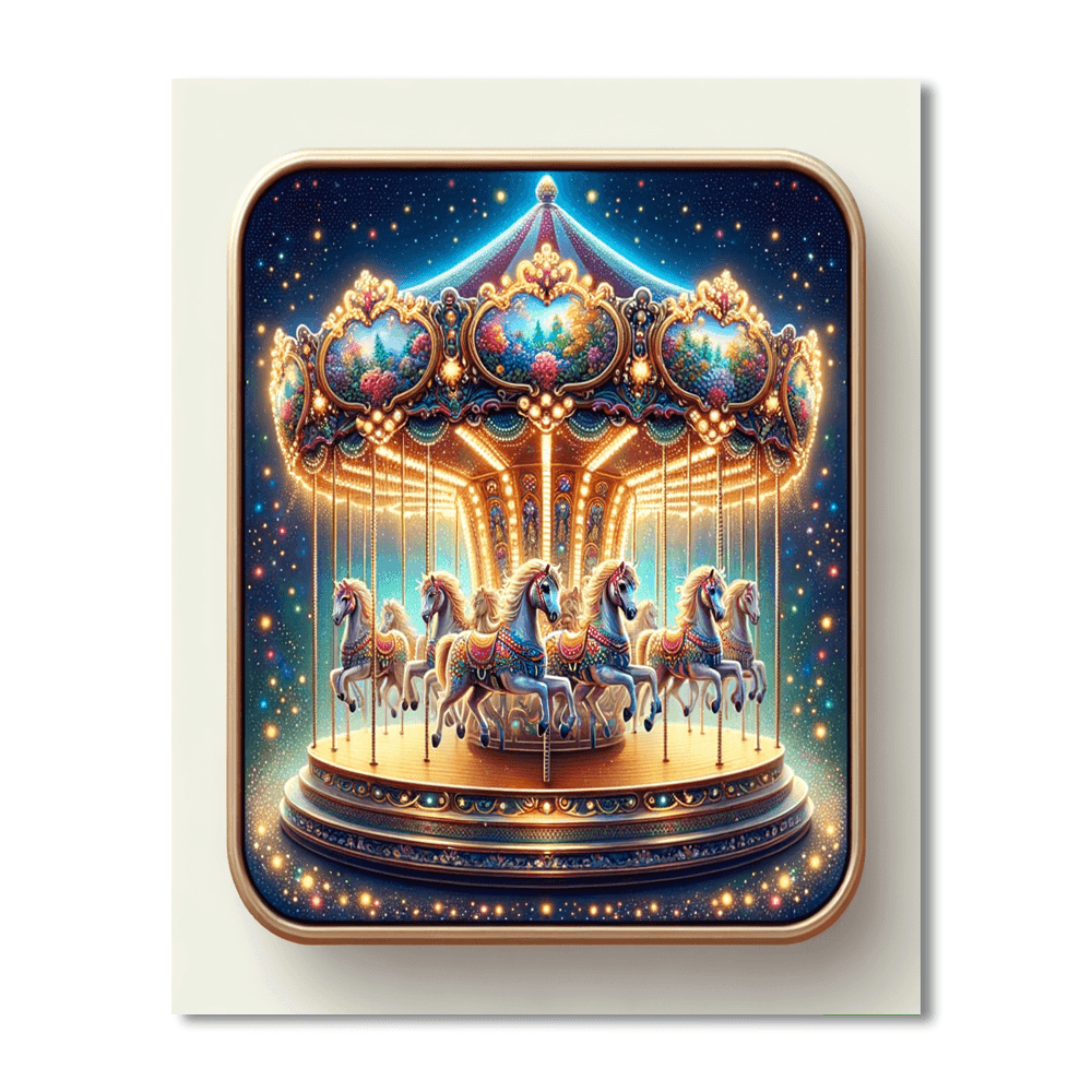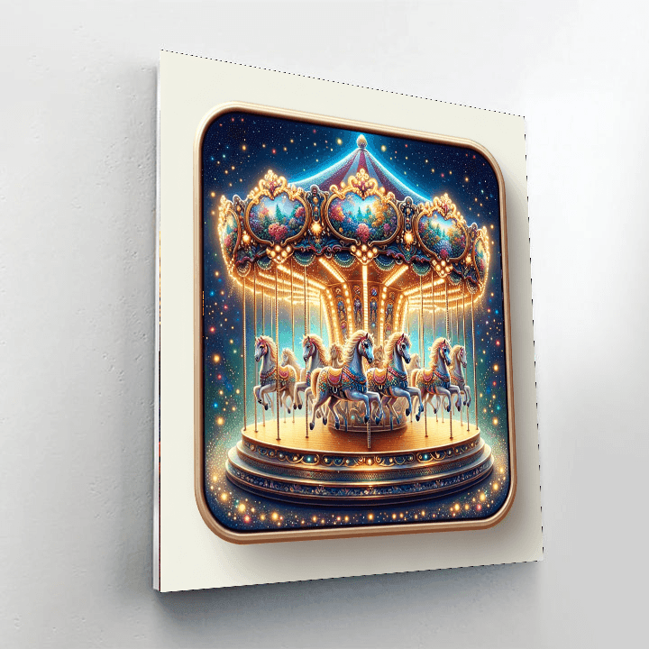 Step into a whimsical world of magic and delight with this enchanting painting of an enchanted carousel. The colorful horses prance and twirl to the music, creating a sense of joy and wonder. This artwork is perfect for adding a touch of whimsy and nostalgia to a childs bedroom or playroom.
