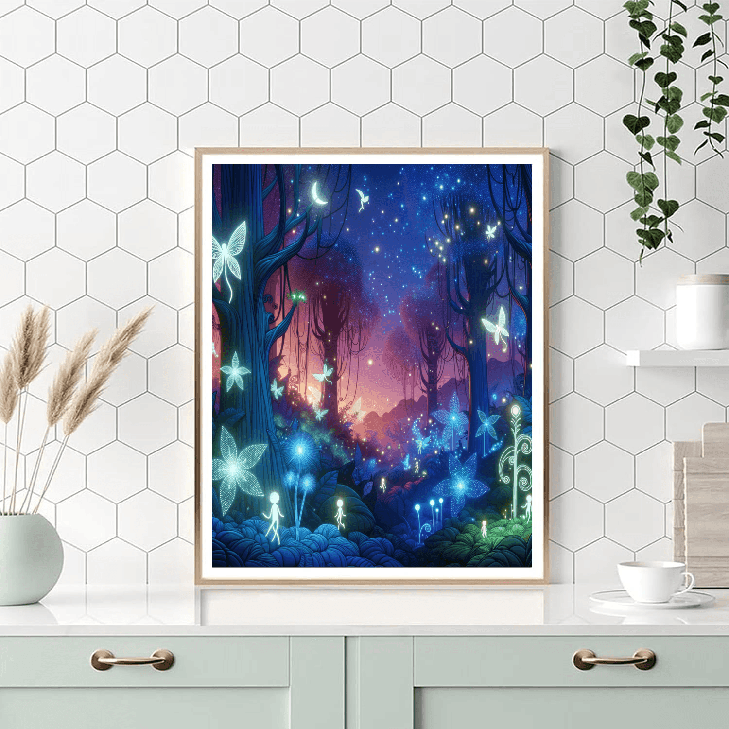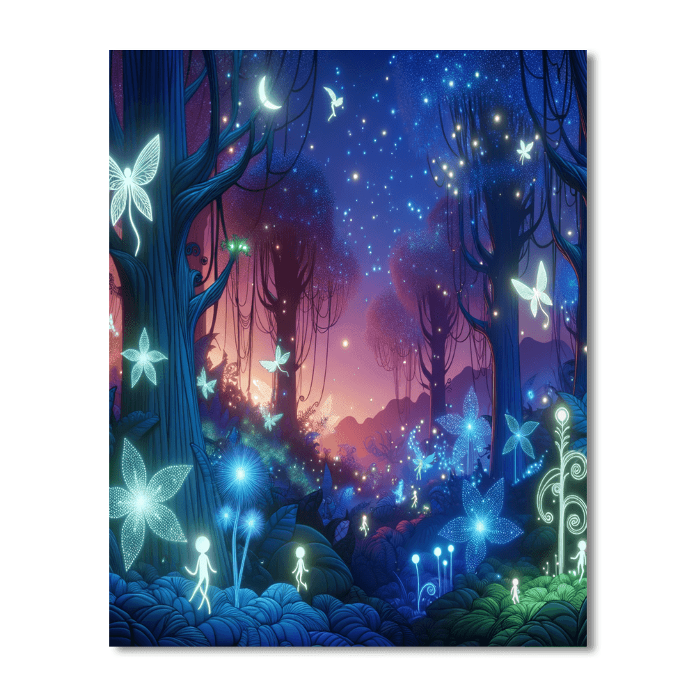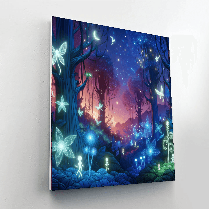 A whimsical fairy forest filled with magical creatures and glowing plants. This enchanting piece is perfect for a kids bedroom or playroom.