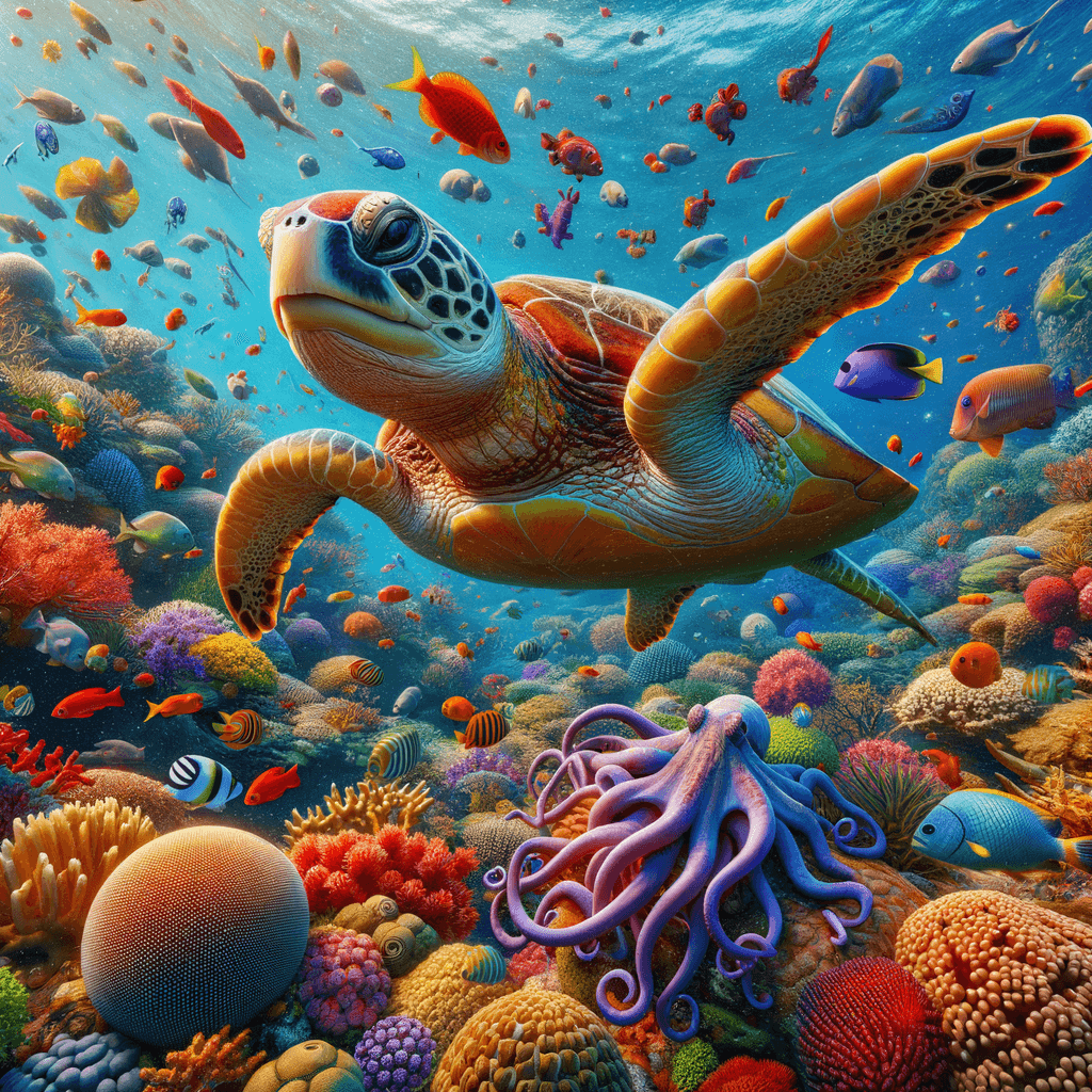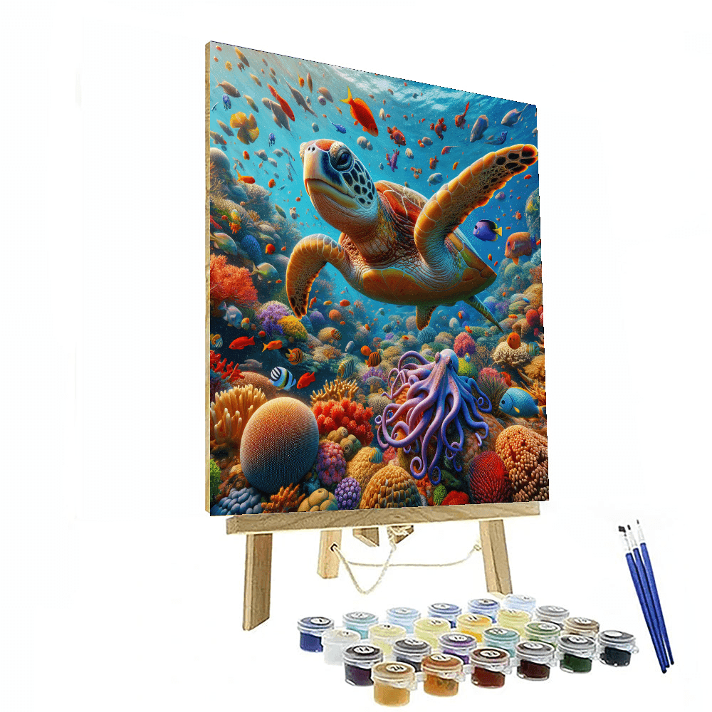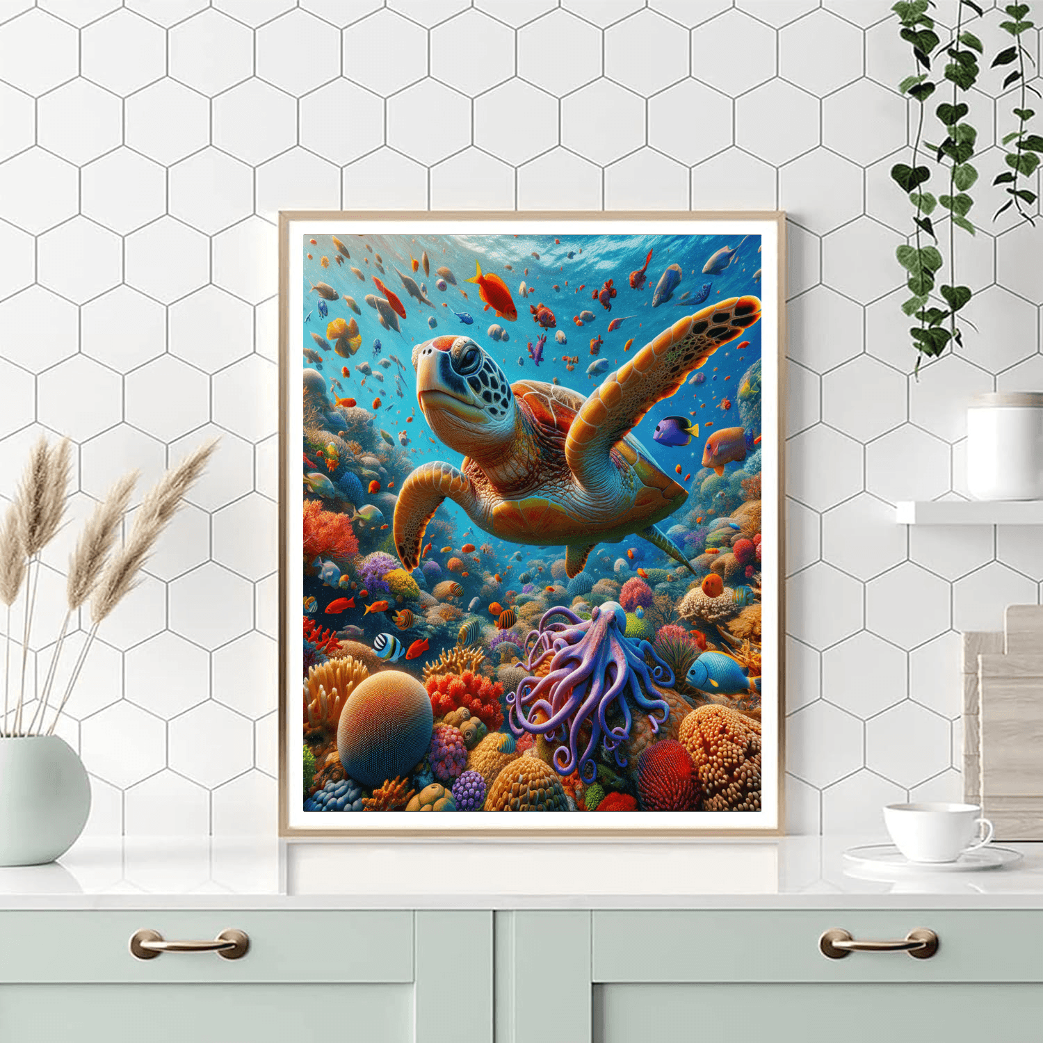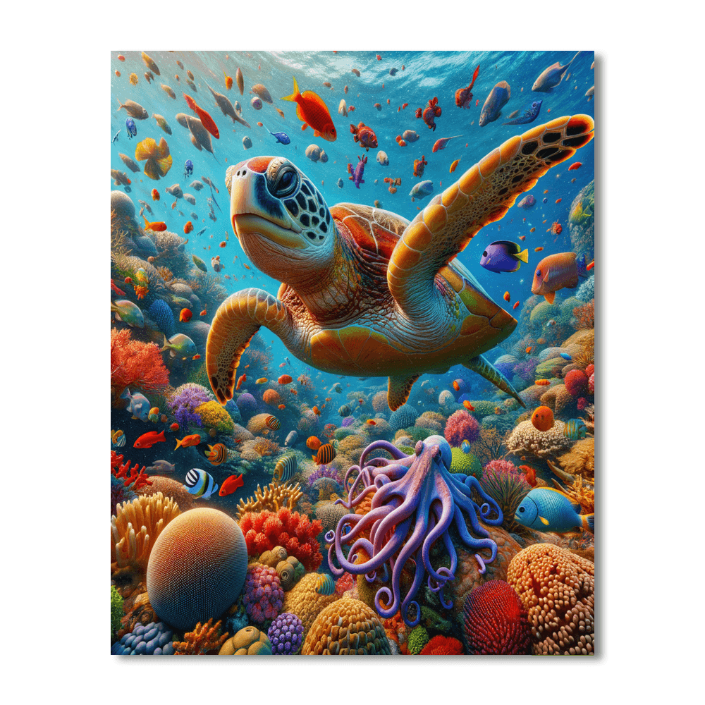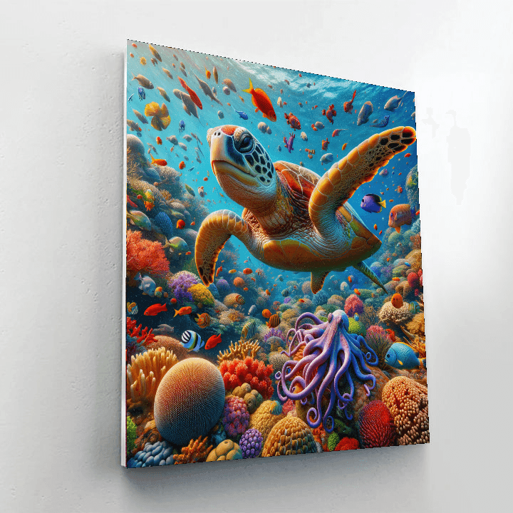 Dive into the depths of the ocean with Whimsical Underwater Coral Kingdom. This vibrant underwater scene showcases a diverse coral reef teeming with colorful marine life, including playful fish, a gentle turtle, and a curious octopus. The vivid colors and dynamic composition make this piece a captivating addition to any space, ideal for childrens rooms or family areas where imagination and creativity are celebrated.