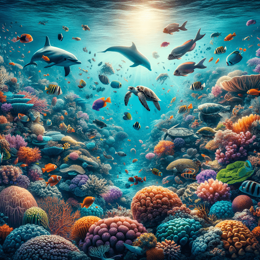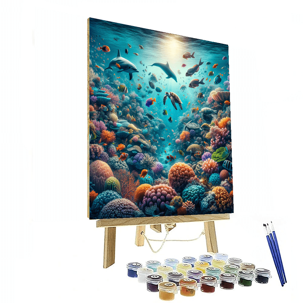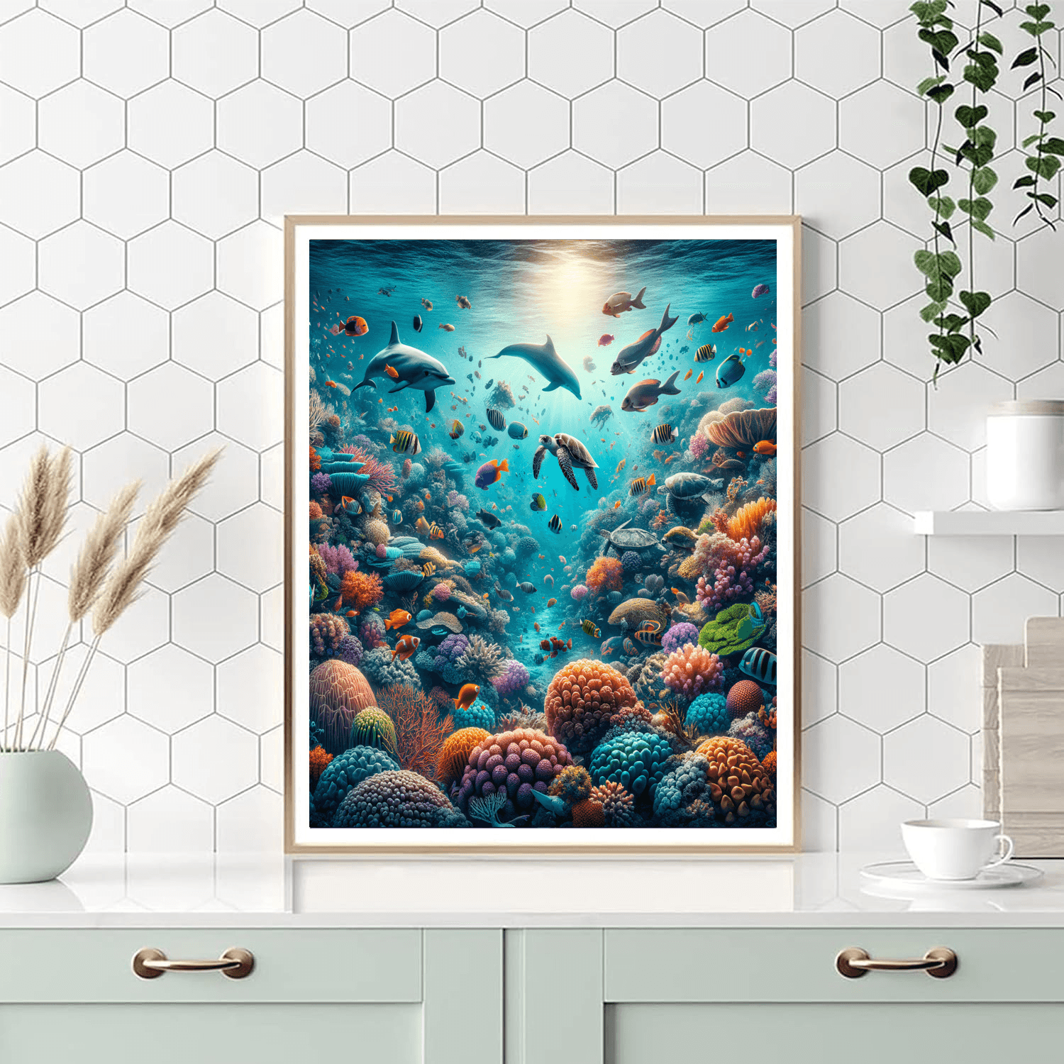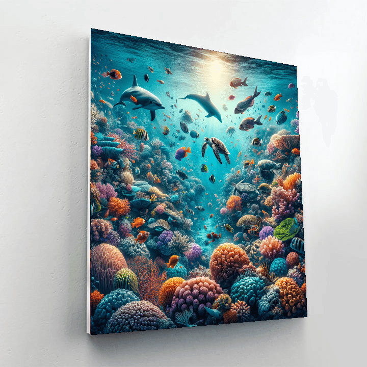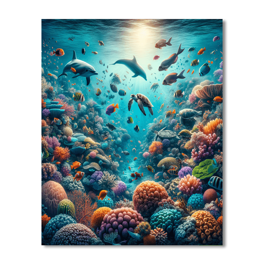 Dive into the depths of the ocean with Whimsical Underwater Coral Reef. This vibrant underwater scene bursts with life, featuring a colorful coral reef teeming with tropical fish, sea turtles, and a playful dolphin. The vivid colors and dynamic composition make this an ideal choice for bringing energy and a splash of color to any room, particularly suitable for bathrooms or childrens bedrooms.