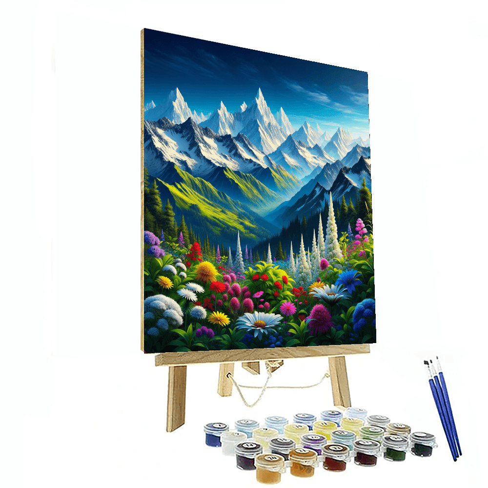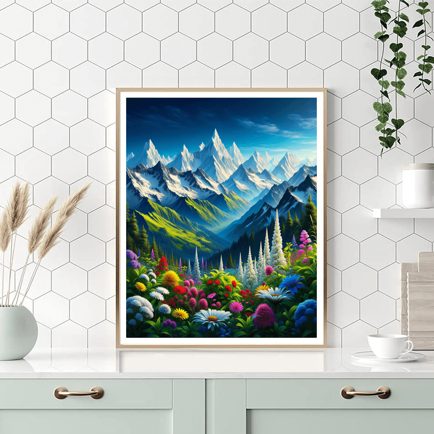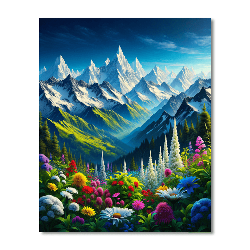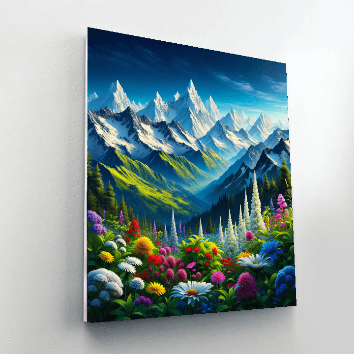 Elevate your décor with Whispering Alpine Peaks. This artwork presents a serene view of snow-capped mountains under a clear blue sky, with a foreground of wild alpine flowers. The crisp whites of the snow contrast with the deep blues and greens of the sky and foliage, creating a refreshing and invigorating scene. Ideal for those who appreciate the majesty of mountain landscapes, this piece is perfect for a study or living room, bringing the tranquility and beauty of the alpine environment into your home.