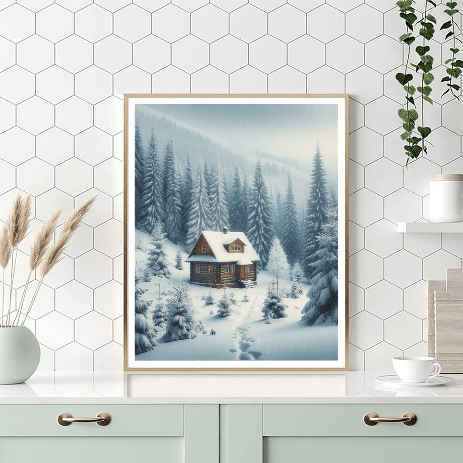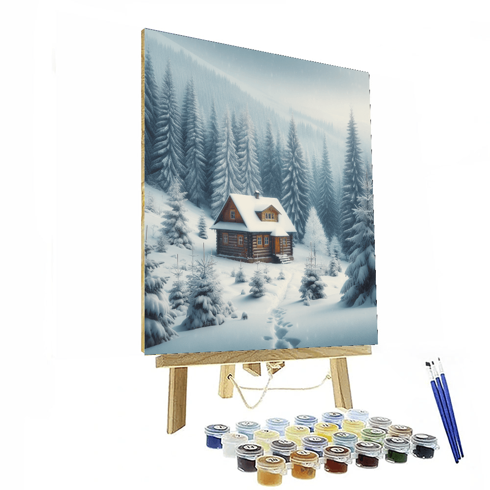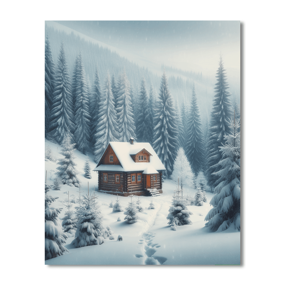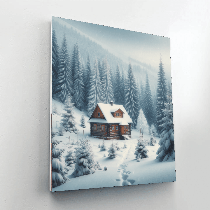 Winters Gentle Embrace depicts a serene snowy landscape, with a small cottage nestled among snow-covered pines under a soft gray sky. This piece evokes the quiet beauty of winter and the cozy solitude it can offer. Its perfect for those who cherish the peaceful silence of snowy days and the comfort of winters embrace. Ideal for a living room or a quiet reading nook, this scene adds a touch of gentle calmness and a reminder of the introspective beauty that winter brings, with its soft snowfalls and the crisp, clean air.