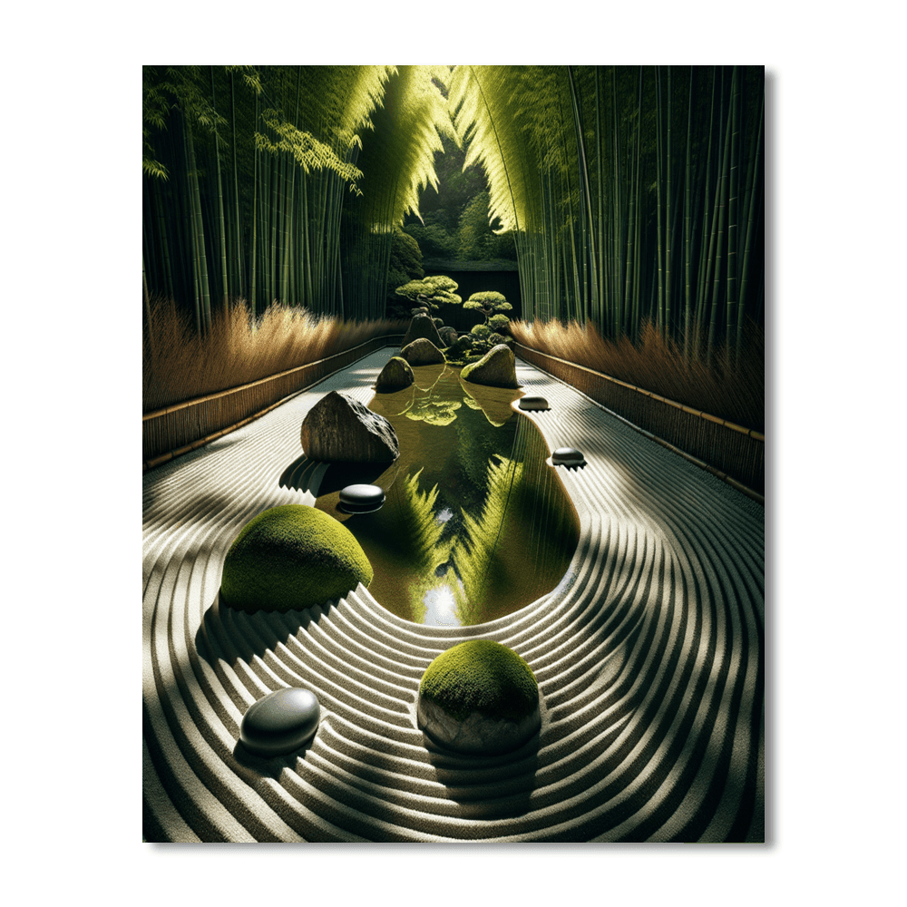 Create a space of peace with Zen Garden Tranquility. This product features a beautifully arranged Zen garden with raked sand patterns, smooth stones, and a small, tranquil pond. Bamboo plants add a touch of greenery, enhancing the calm and meditative atmosphere. Perfect for spaces dedicated to relaxation, meditation, or yoga.